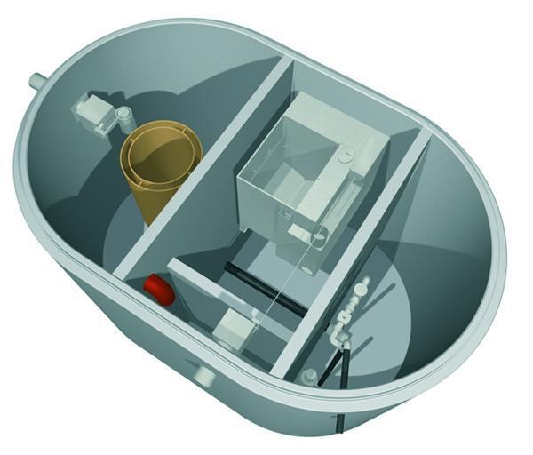 So können zwei verschiedene Teilströme in einem Becken behandelt werden. Das Waschwasser aus Portalwaschanlagen läuft in den Schlammfang des Ovalbeckens und dann weiter in einen Stapelraum im gleichen Becken, von wo aus es weiter zur Feinfiltrierung und danach zur Waschanlage gepumpt wird. Das stark belastete Abwasser aus den SB-Plätzen und das Überschusswasser aus dem Waschanlagenkreis laufen über den Ölabscheider, der ebenfalls im gleichen Becken untergebracht ist.