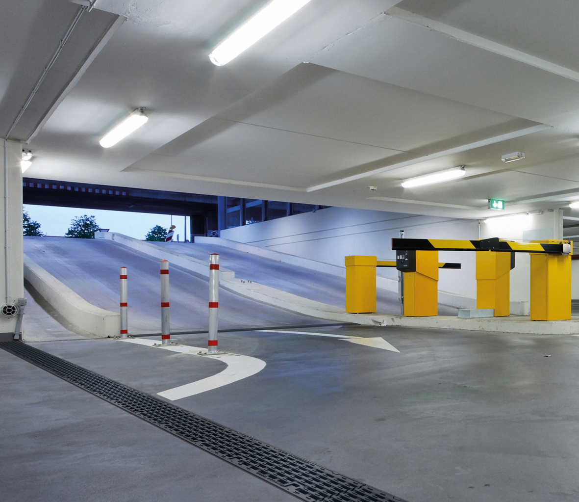 Bei der Planung war zu berücksichtigen, dass auch im Innenbereichen der großen Hallen Oberflächenwasser abgeleitet werden muss und dass die Rinnenstränge den hohen Lasten der schweren Fahrzeuge standhalten. Zum Einsatz kamen deshalb Tiefbaurinnen vom Typ ACO DRAIN® Powerdrain V 175/200 P. Der massive, 8 mm starke Kantenschutz, sowie die Zargen und Gussstegroste aus EN-GJS (Belastungsklasse F 900) ermöglichen das Befahren mit besonders hohen Radlasten.