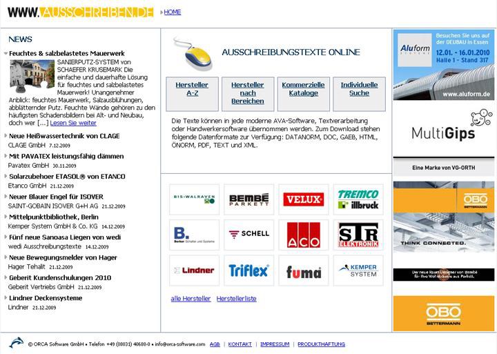 Wer Produktbeschreibungen eines bestimmten Herstellers sucht, kommt über das Firmenlogo geradewegs auf dessen Katalog. Aktuelle Informationen zu Produkten oder den vertretenen Unternehmen findet der Ausschreibende im Bereich "News"; um über Innovationen auf dem Laufenden zu bleiben. Ein wichtiger Aspekt, den stetig steigenden Anforderungen sowohl von Bauherrenseite als auch vom Gesetzgeber gerecht zu werden.