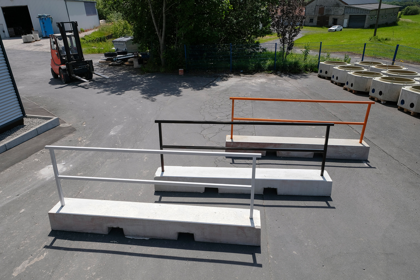 Die neue Absturzsicherung von Fasel besteht aus einem Stahlbetonbalken mit den Abmessungen 3,00 m x 0,40 m x 0,30 m. Der Balken, der mit Aussparungen für eine Staplergabel produziert wird, wiegt rund 800 kg und ist damit auch mit leichtem Baugerät gut verfahrbar.