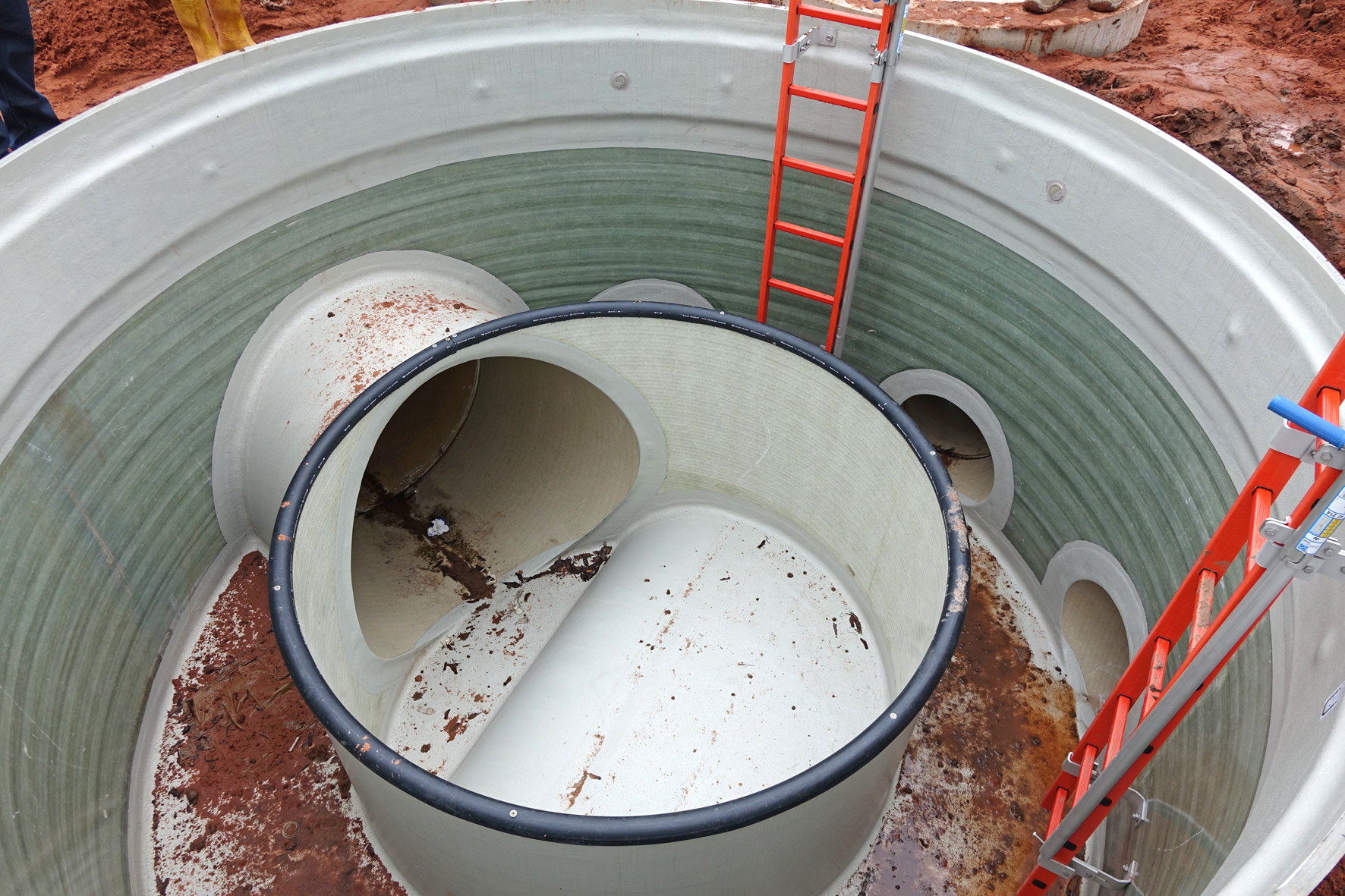 Die beiden kürzeren Rohre sind 10 m, die längeren 40 m lang. Darüber hinaus ist das Stauraumsystem mit einem GFK-Drosselschacht DN 2400 und einem GFK-Entlastungsschacht DN 3400 mit einem Kelch in DN 2000 für eine Entlastungsmenge von 3360 l/s ausgestattet. Der Stauraum selbst ist begehbar und zeigt das für GFK-Rohre übliche sehr gute Ausspülverhalten.