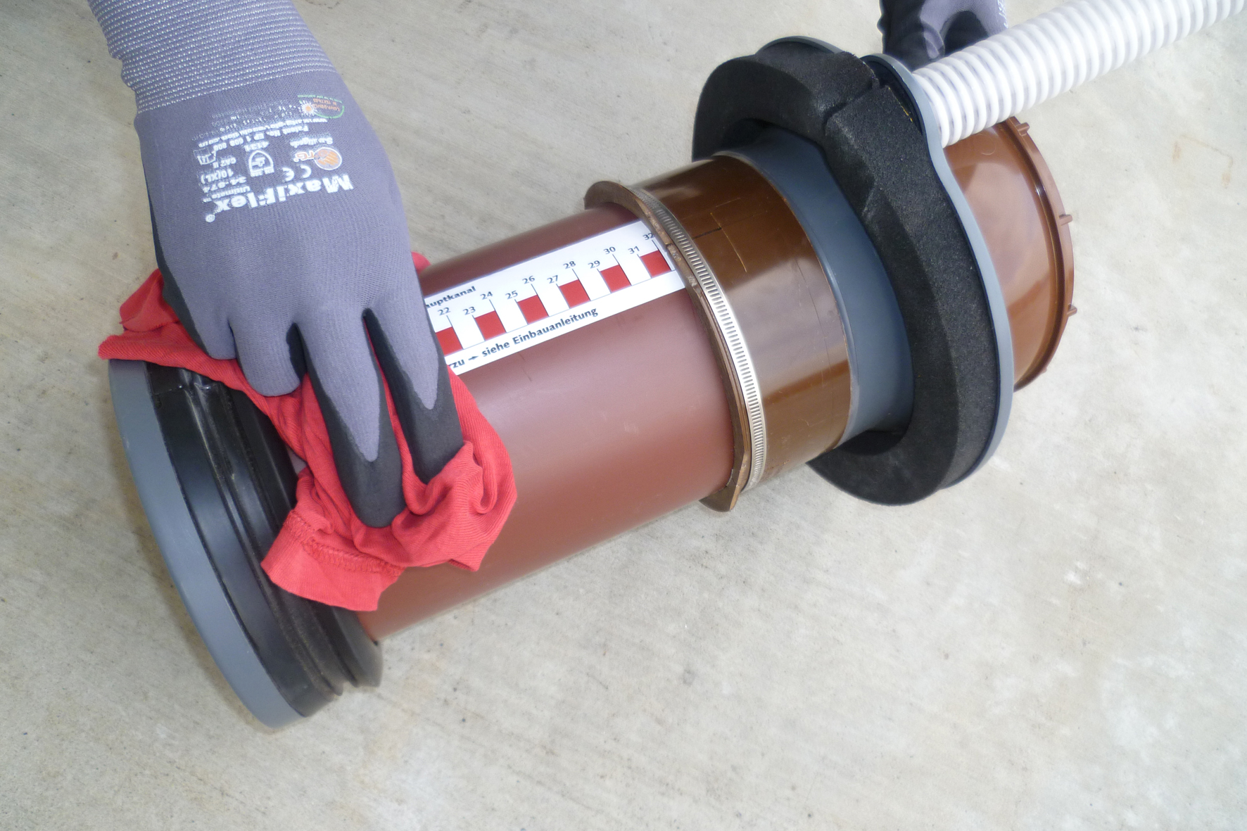 Der Teleskopanschluss von Funke erfüllt diese Ansprüche in vollem Umfang. Auch sein Einbau gestaltet sich einfach: Zunächst wird der Teleskopanschluss individuell an die Einbausituation angepasst. Eine auf dem Rohr angebrachte Skalierung ermöglicht das zentimetergenaue Ablängen.