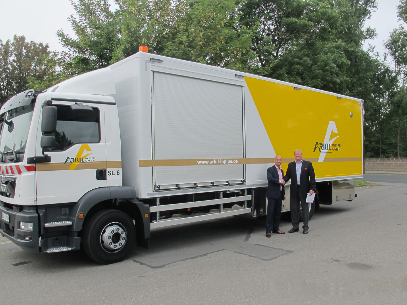 Arkil Inpipe GmbH wird zukünftig verstärkt große Nennweiten einbauen. Daher wurde die Anlage gemeinsam mit dem Hersteller entsprechend individuell konzipiert. Der Kofferaufbau beherbergt einen übersichtlichen Arbeitsplatz mit großem Bedienpult für den Operateur, einen geräumigen Aufenthaltsraum für die Kolonne und ein großzügiger Arbeitsbereich für das Handling der UV-Strahler. Die Anlage ist mit einem leistungsstarken Generator, Klimageräten und einem luftgewaltigen Schrauben‐Verdichter ausgestattet. Die klimatisierte Kabeltrommel mit 300 Metern Aushärtekabel ermöglicht die Sanierung von sehr langen Kanalabschnitten in einem Arbeitsgang.