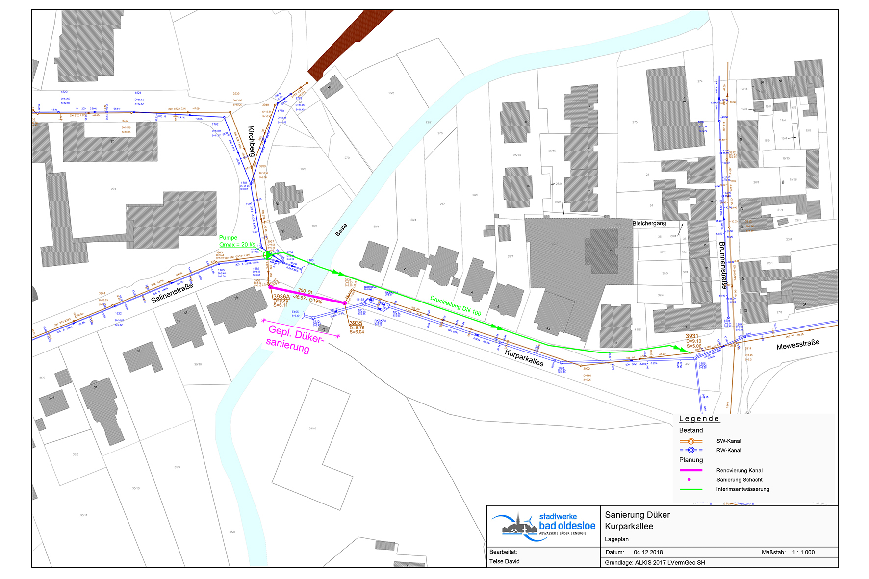 Insgesamt wurden von der Niederlassung Oldenburg der D&S Rohrsanierung drei Düker und diverse Schachtbauwerke saniert, wobei die Schächte gereinigt und neu beschichtet wurden und die Gerinne eine GFK-Auskleidung erhielten. Die Düker – so auch jener, der von der Brunnen-Straße bis in die Bestor-Straße verläuft – wurden mit dem DS CityLiner-Verfahren ausgekleidet.