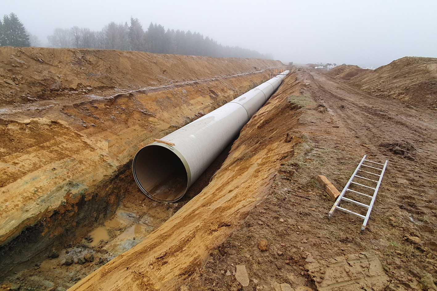 Das sei kostengünstiger gewesen. Und einen weiteren positiven Effekt – das geringe Rohrgewicht bei gleichzeitig großen Rohrlängen – hebt Ralf Paul, Amiblu Außendienstmitarbeiter, hervor: „Unsere GFK-Rohre hatten jeweils eine Länge von 12 m. Das heißt, während ein GFK-Rohr verlegt worden ist, hätten für dieselbe Baulänge vier bis fünf Betonrohre verlegt werden müssen.“