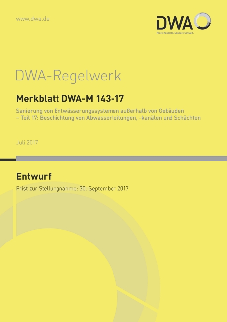 Die Deutsche Vereinigung für Wasserwirtschaft, Abwasser und Abfall e. V. (DWA) hat den Entwurf des Merkblatts DWA-M 143-17 „Sanierung von Entwässerungssystemen außerhalb von Gebäuden – Teil 17: Beschichtung von Abwasserleitungen, -kanälen und Schächten und den Entwurf des Merkblattes DWA-M 146 „Abwasserleitungen und -kanäle in Wassergewinnungsgebieten – Hinweise und Beispiele“ veröffentlicht.