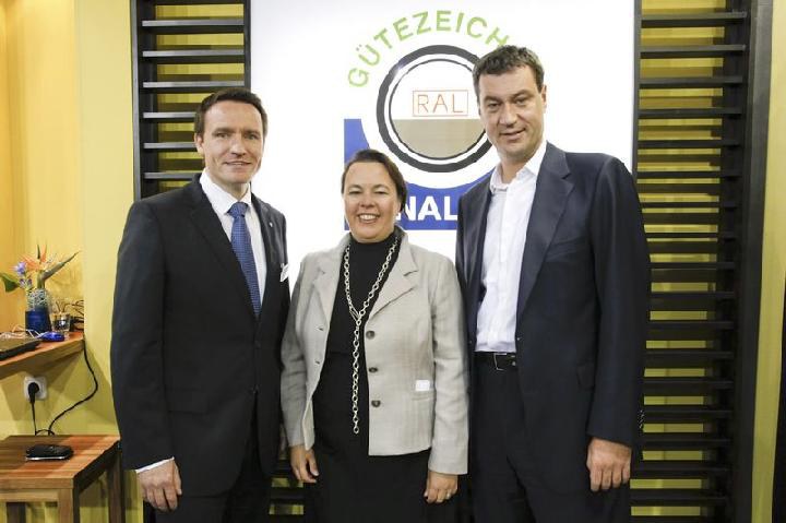 Prominenter Besuch: Parlamentarische Staatssekretärin im Bundesministerium für Umwelt, Naturschutz und Reaktorsicherheit, Ursula Heinen-Esser und Dr. Markus Söder, Staatsminister im Bayerischen Staatsministerium für Umwelt und Gesundheit (re.) im Gespräch mit Dr. Marco Künster über Aspekte der Gütesicherung RAL-GZ 961.