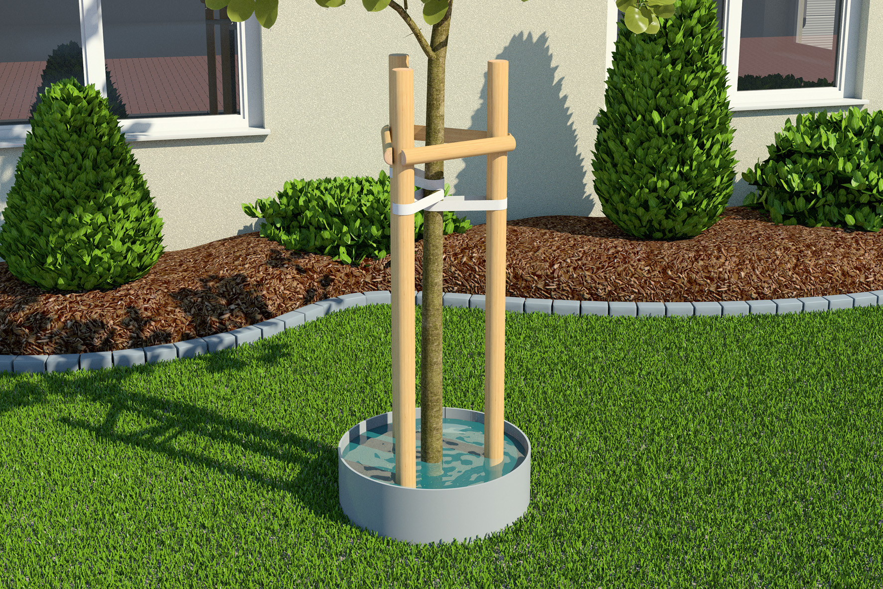 Mit dem Gießring hat Funke das Baumschutz-Sortiment um eine effektive Lösung für die Bewässerung von Baumpflanzungen ergänzt. Der aus schlagzähem, wetterfestem Kunststoff gefertigte Ring sorgt in der Anwuchsphase für die optimale Bewässerung frisch gesetzter Bäume. Wasser fließt nicht mehr ab, sondern wird zielgerichtet zum Wurzelballen geleitet. Gleichzeitig bietet der Gießring Schutz vor seitlichen Mähschäden und Streusalz.