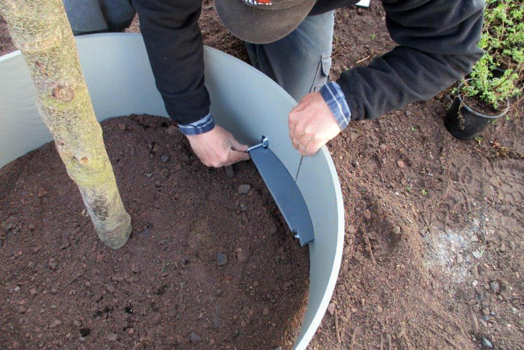 Für das leichte Einbringen des Gießrings in die Pflanzgrube sorgt die gewellte Unterkante des Bauteils in der Nennweite DN 800. Zusätzliche Formstabilität gewinnt der Gießring durch eine innen angebrachte Arretierung, die beim Setzen einfach mit der Hand verriegelt wird.