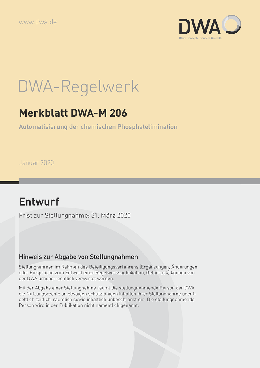Das Merkblatt DWA-M 206 wurde von der DWA-Arbeitsgruppe KA-13.4 „Automatisierung der chemischen Phosphatelimination“ (Sprecher: Prof. Dr.-Ing. Peter Baumann) im Auftrag des DWA-Hauptausschusses „Kommunale Abwasserbehandlung“ (HA KA) im DWA-Fachausschuss KA-13 „Automatisierung von Kläranlagen“ erarbeitet. Es richtet sich an Betreiber von Abwasserbehandlungsanlagen, planende Ingenieure und Genehmigungsbehörden.