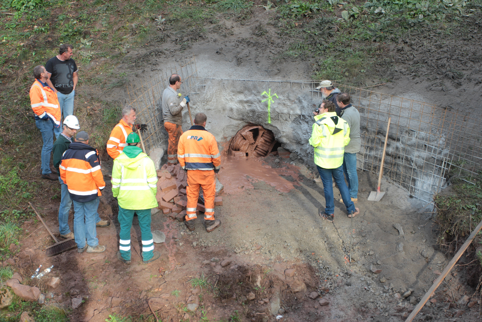 Der Tunnelausbau erfolgte mittels Stahlbeton-Vortriebsrohren (DN 800, DA 1100) mit einer Länge von 3 Metern. Nach 3 Wochen Vortrieb erreichte die Herrenknecht-Maschine Ende Oktober ihr Ziel am Fuße eines Hanges und wurde per Autokran aus der Baugrube gehoben.