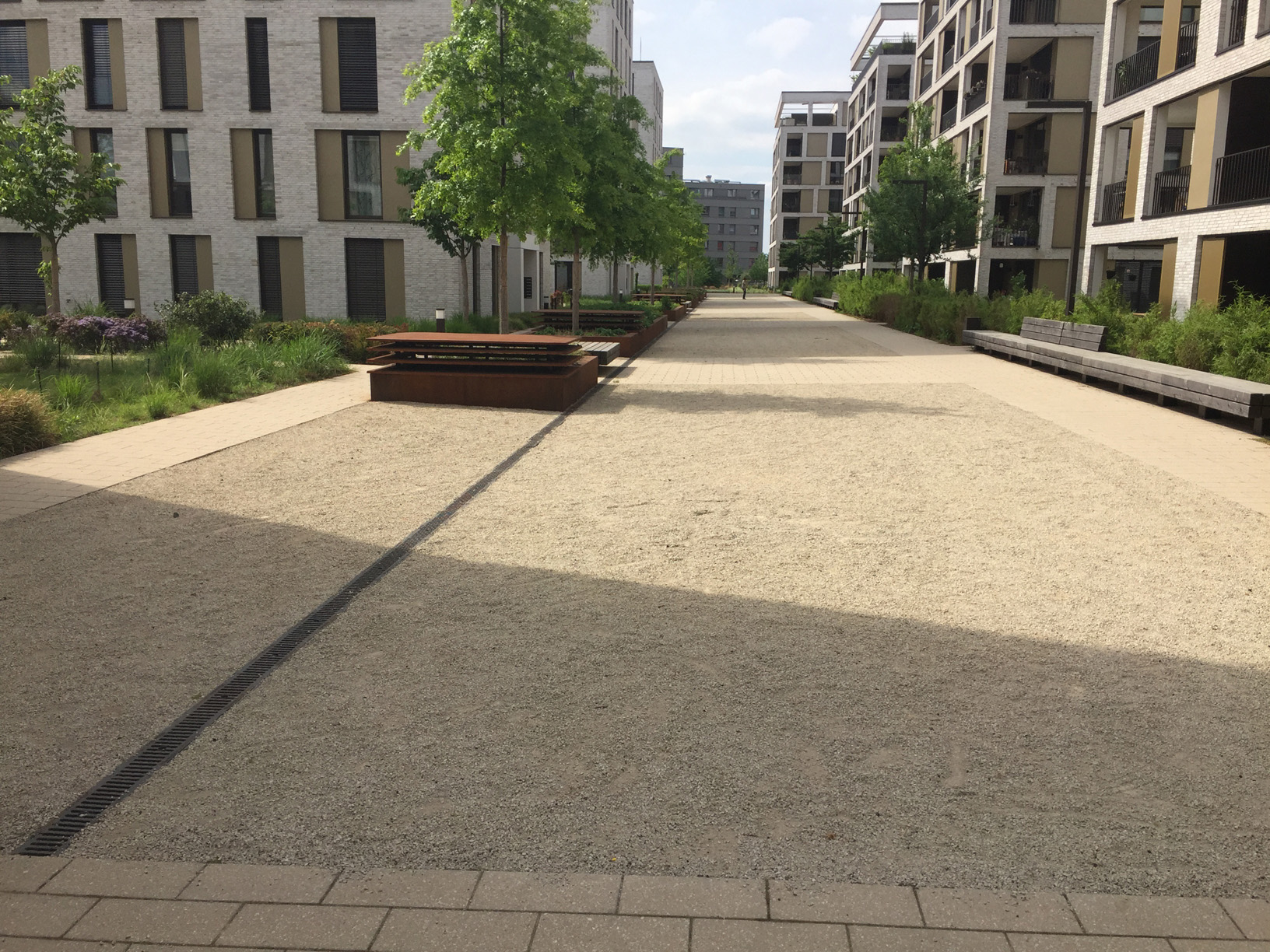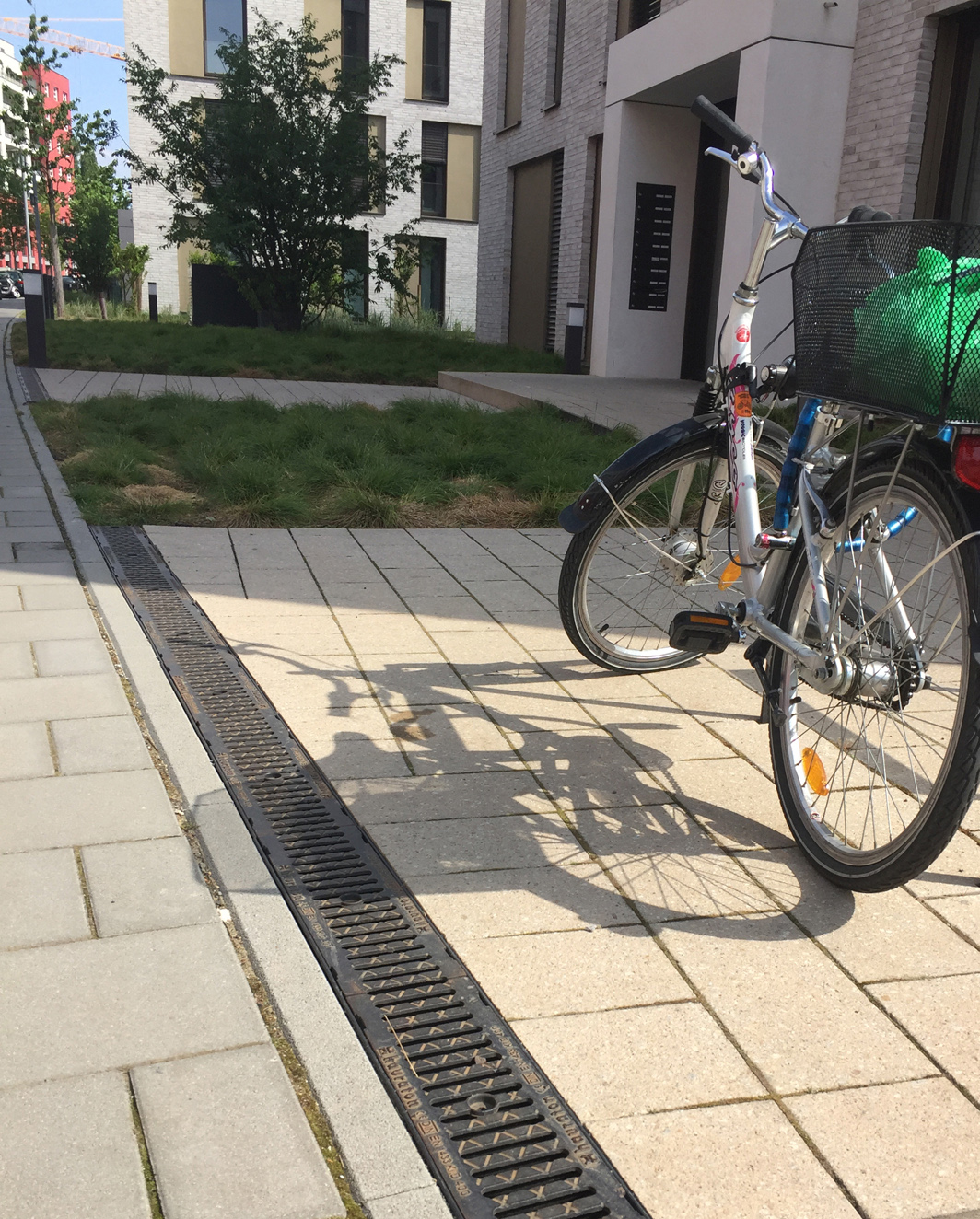 An den Hauseingängen ließen sich in Projekt Hafeninsel Recyfix Pro Rinnen als besonders praktikabel einbauen. Hier kam es auf Korrosionsfreiheit, ein durchgängig gleiches Aussehen der Abdeckungen und auf die einfache Verarbeitung an. Operativer Pluspunkt war, dass Recyfix Pro Rinnen sich besonders leicht verlegen lassen. Ohne Hebezeuge können die Kunststoffrinnen von Hand eingebaut werden.