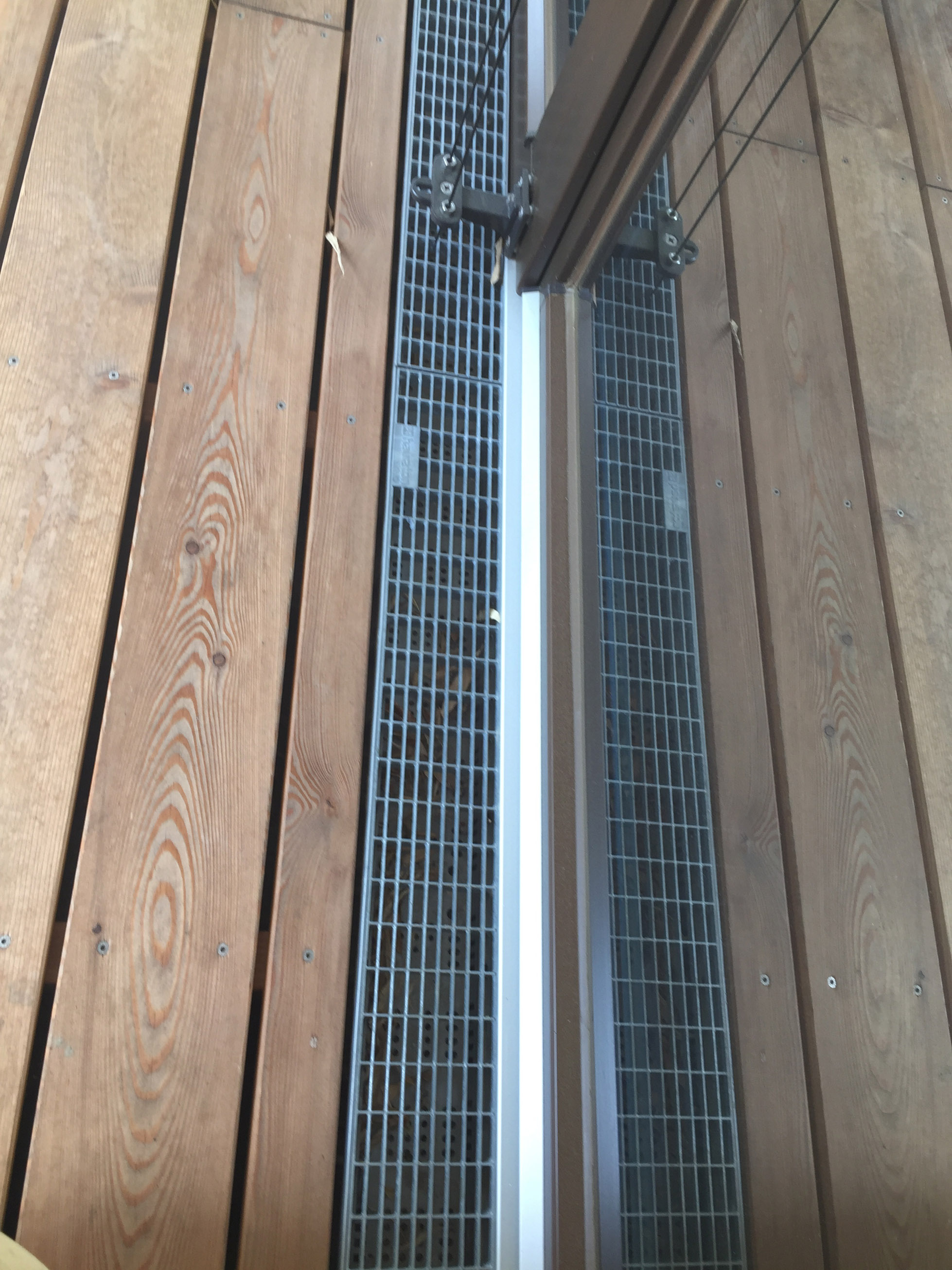 Terrassenbelag niveaugleich eingebauten Abdeckung der Rinnen – beim Bauvorhaben Hafengold sind das Gitterroste mit einer eleganten, engen Maschenweite von 30 mal 10 Millimeter. Zum anderen sind die Rinnenkörper durchgängig perforiert.