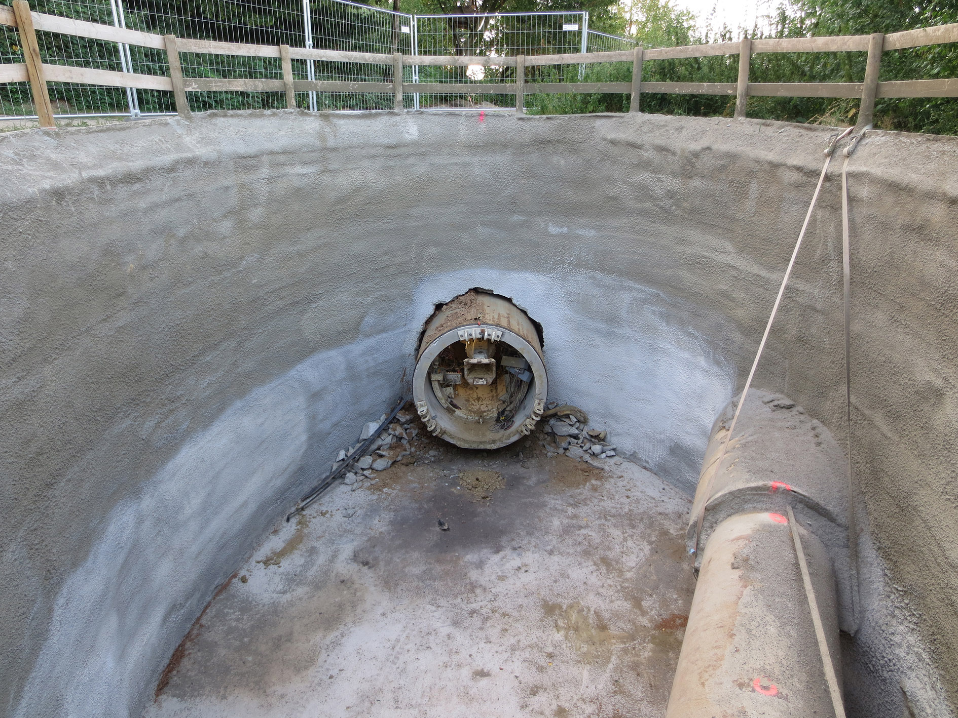 Ein wichtiger Teilschritt der Kanalarbeiten wurde nun erfolgreich abgeschlossen: Die größte Einzelstrecke ist nach 450 Metern im unterirdischen Vortrieb punktgenau in der Zielbaugrube wieder zum Vorschein gekommen. Rund 130 Stahlbetonrohre mit einem Gesamtgewicht von 1.400 Tonnen wurden zwischen Ende Mai und Anfang August in einer Pressung in die Erde gebracht.