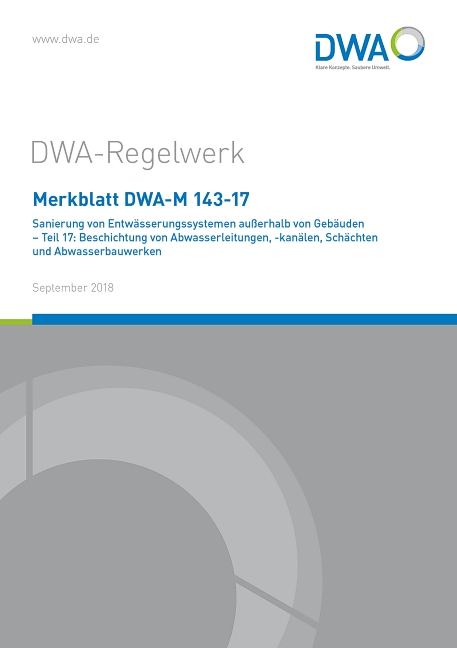 Das Merkblatt DWA-M 143-17 „Sanierung von Entwässerungssystemen außerhalb von Gebäuden – Teil 17: Beschichtung von Abwasserleitungen, -kanälen, Schächten und Abwasserbauwerken“ wurde von der DWA-Arbeitsgruppe ES-8.14 „Beschichtungsverfahren“ (Sprecher: Dipl.-Ing. Rainer Hermes) im DWA-Fachausschuss ES-8 „Zustandserfassung und Sanierung“ erstellt und richtet sich sowohl an alle im Bereich der Sanierung von Entwässerungssystemen planenden, betreibenden sowie Aufsicht führenden Institutionen als auch an ausführende Firmen.