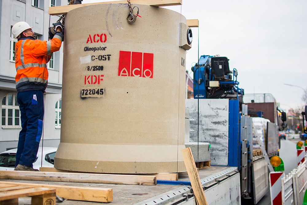 „Das ist ja nicht der erste Abscheider aus Polymerbeton, den wir verarbeiten“, so Jens Berensen, Bauleiter bei Petershagen, Weyhe. „Wir haben bei zwei vorherigen Projekten bereits Erfahrung beim Verarbeiten von Polymerbetonabscheider gesammelt. Was uns hierbei besonders gefällt: Polymerbetonabscheider wiegen nur halb so viel wie übliche Betonabscheider. Das gibt uns willkommene Freiheiten hinsichtlich des Einhebens in die Baugrube. Wir sind dadurch flexibler, weil wir teure Krane nicht termingenau koordinieren müssen. In der Regel können wir Polymerbetonabscheider mit dem Bagger in die Baugrube einheben. Insofern zeigen wir die einfache Handhabung und Abläufe auch gerne unserem Lieferanten ACO und natürlich auch unserem Auftraggeber, der Firma Topteq.“