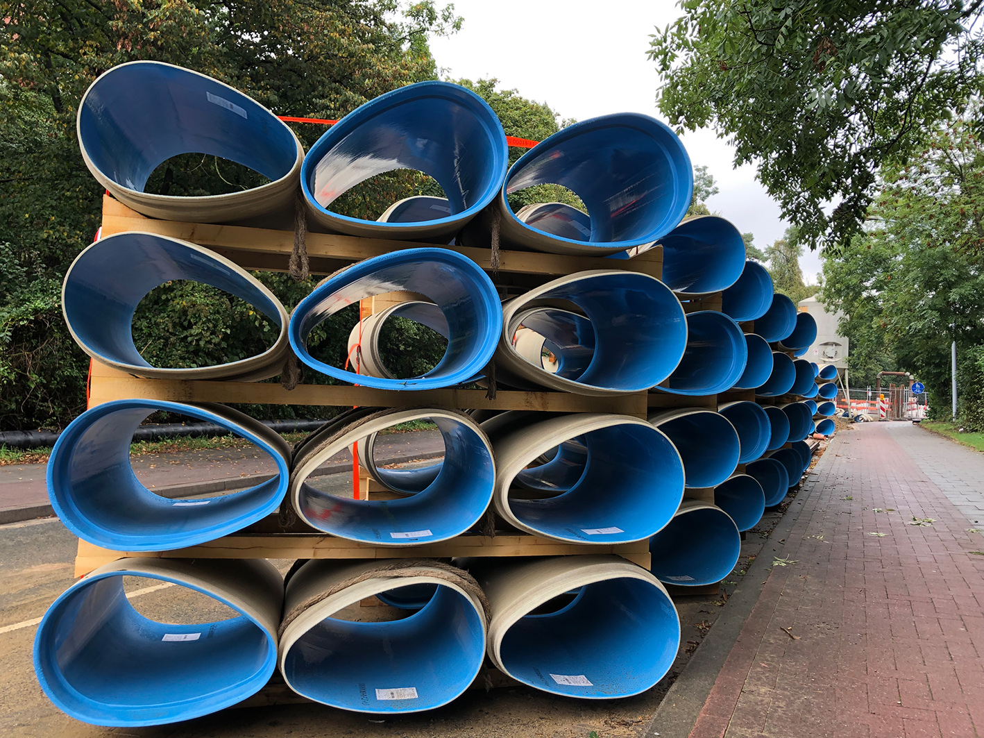 Ich spreche hier gerne – vielleicht etwas unkonventionell – von einem geschlossenen Ersatzneubau. Denn mit dem Einzelrohr-Lining wird mit nicht-kreisrunden (NC Line) oder runden Amiblu GFK-Rohren ein vollwertiger Neubau erstellt, ohne dabei aber die Straße aufzureißen. Das neue Rohrsystem, und das ist unser besonderes Qualitätsversprechen, entsteht nicht in situ auf der Baustelle, sondern wird unter definierten, optimalen Bedingungen im Werk gefertigt und auf der Baustelle dann nur noch eingebaut.