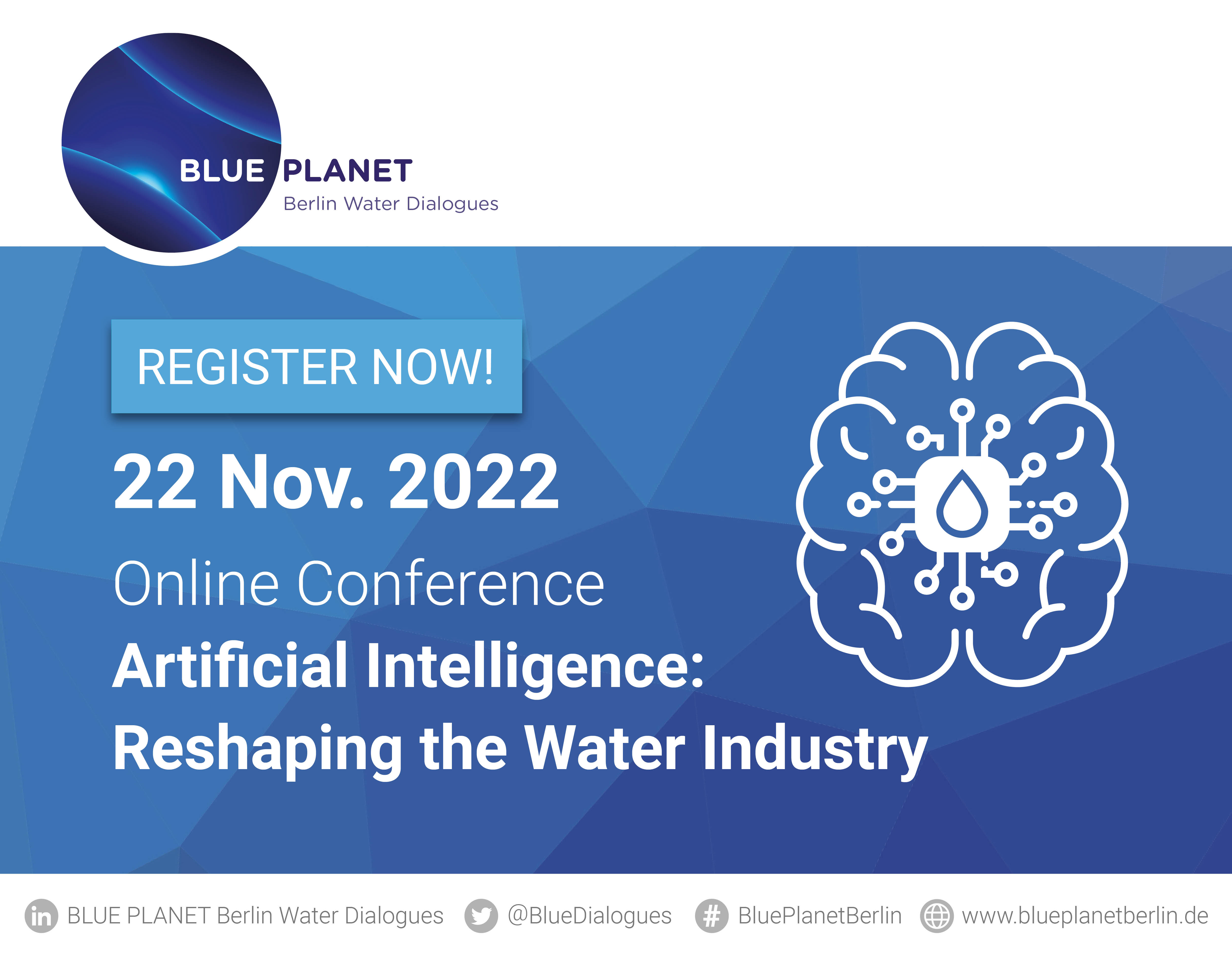 Mit den BLUE PLANET Berlin Water Dialogues hat sich in den vergangenen Jahren ein qualifiziertes englischsprachiges Forum zum Wissens-, Ideen-, Konzept- und Erfahrungsaustausch zwischen Politik, Wasserwirtschaft, WissenschaftlerInnen und Nicht-Regierungsorganisationen entwickelt und etabliert. Hier werden gemeinsam globale Herausforderungen diskutiert sowie deutsche und internationale Kompetenzen und Lösungsansätze vorgestellt und beworben. Der Schwerpunkt liegt darauf, Synergien im Bereich Forschung und Entwicklung zwischen Unternehmen und wissenschaftlichen Einrichtungen nachhaltig zu fördern. Damit sollen praxisnahe Innovationen, etwa aus den Bereichen nachhaltige Entwicklung und Künstliche Intelligenz, in der Wasserwirtschaft oder dem Umweltschutz, durch ressourceneffiziente Technologien vorangetrieben werden. BLUE PLANET 2022 wird vom Kompetenzzentrum Wasser Berlin gGmbH und German Water Partnership e.V. zusammen mit den Berliner Beratungsunternehmen T-Base Consulting GmbH und eclareon GmbH organisiert.