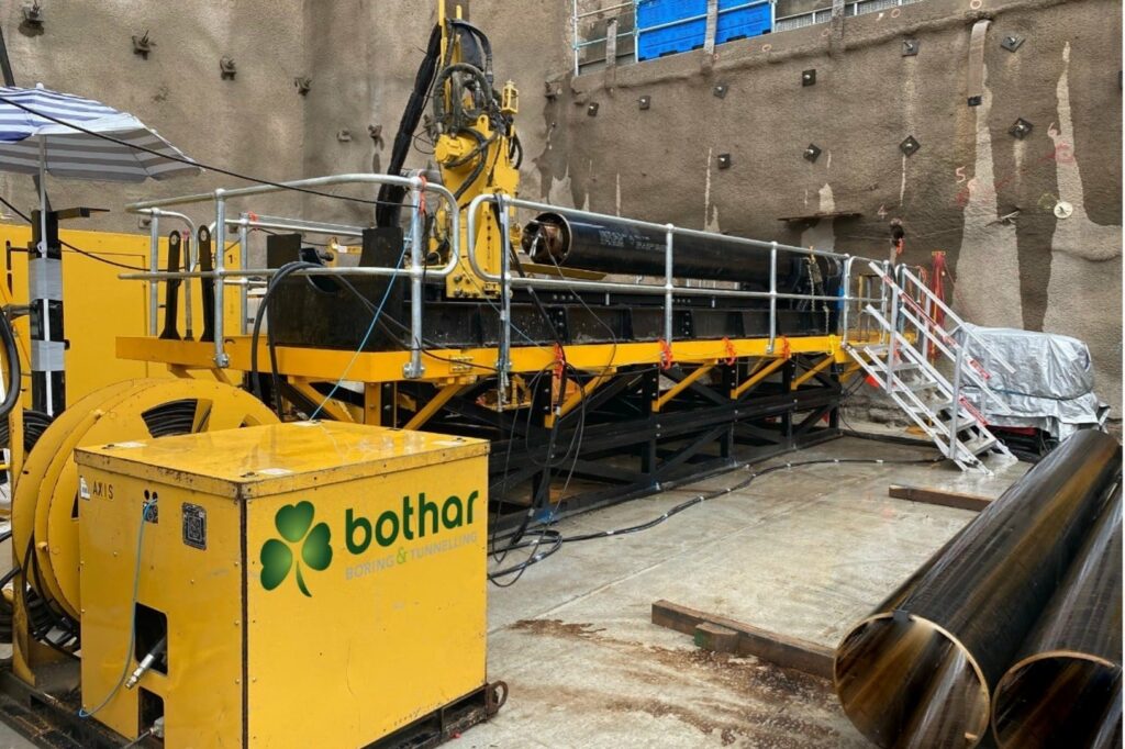 The unique cutting head consists of three 13 ¾-inch and three 9-inch tri-cone type TCI cutters on a 50mm backing plate with water portability and outer cutters spring loaded on a 40mm greaseable solid bar hinge. A laser guided vacuum system was used to achieve tight design tolerances at significant lengths. The modified head was developed to ensure the tunnel is always supported by the installation of steel casing in the unlikely but possible case of ground movement. The cutting head has since been used successfully on several projects in adverse, mixed ground conditions up to 200Mpa. Furthermore, tackling other obstacles such as ‘blind boring’ into service manholes is now no problem with the use of this cutting head, changing the landscape of underground construction. Bothar’s ability to utilise its vast trenchless experience to innovate such a design is backed by its inhouse workshop facility. This gives Bothar Boring an additional advantage in the ever-evolving trenchless arena for future works.