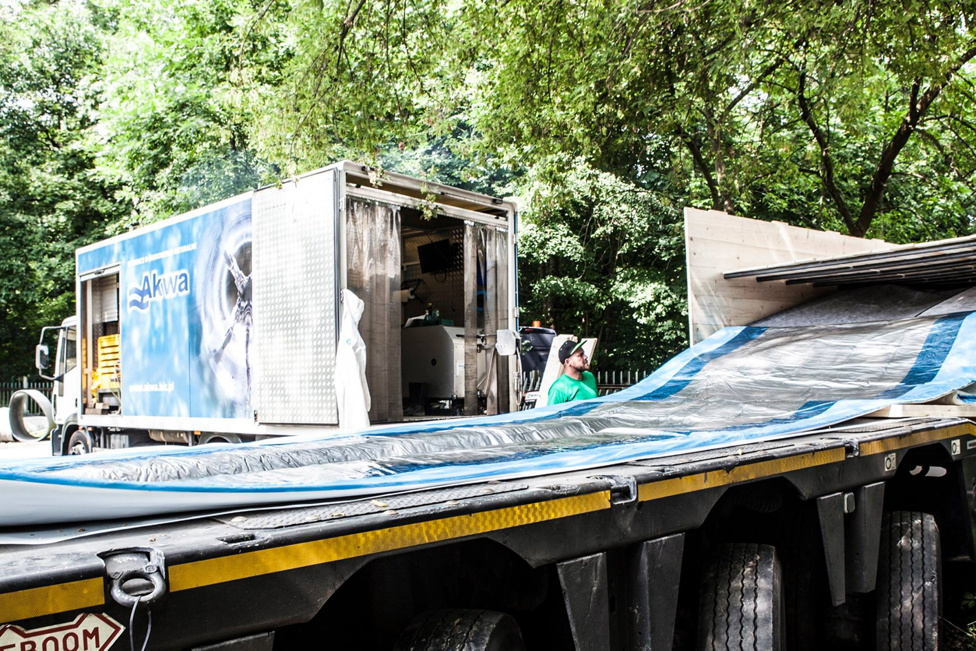 Für die Ankunft des Liners mussten der Kanal und seine beiden Zugänge links und rechts der Weichsel präpariert werden. Mitarbeiter von AKWA hatten vorab breite Fenster sowie eine Baugrube an dem Zugang ausgehoben, von wo später der Liner reingezogen werden soll.