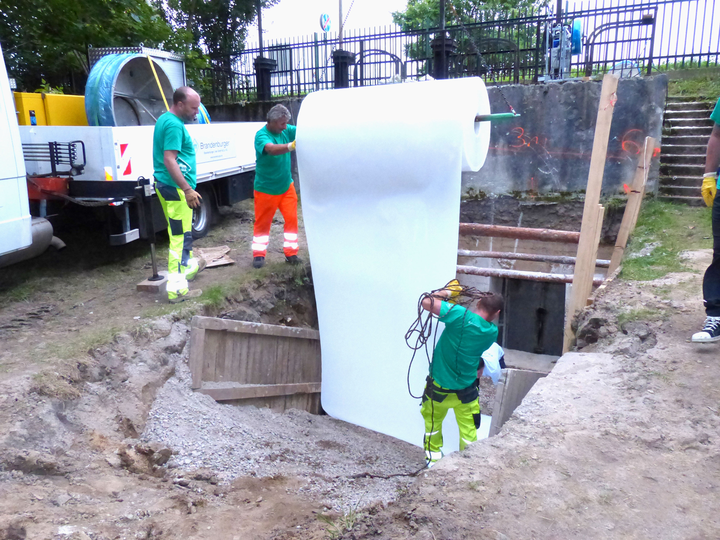 In Krakau ging es dann unter der Leitung von Marc Albrecht für das Team der Anwendungstechnik der Brandenburger Liner GmbH & Co. KG sowie für Mitarbeiter der AKWA Sanierungstechnik GmbH unter der Leitung von Piotr Grawżym acht Meter tief in den Kanal. Und beim Durchqueren noch einmal tiefer, da der Düker – eine Druckleitung zur Unterquerung eines Flusses – noch einmal um zwei Meter abfällt. Es war aber nicht der Düker, der den Prüfstein dieser Baustelle darstellte, sondern vielmehr andere örtliche und technische Umstände.