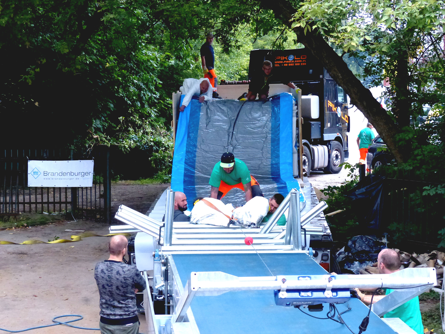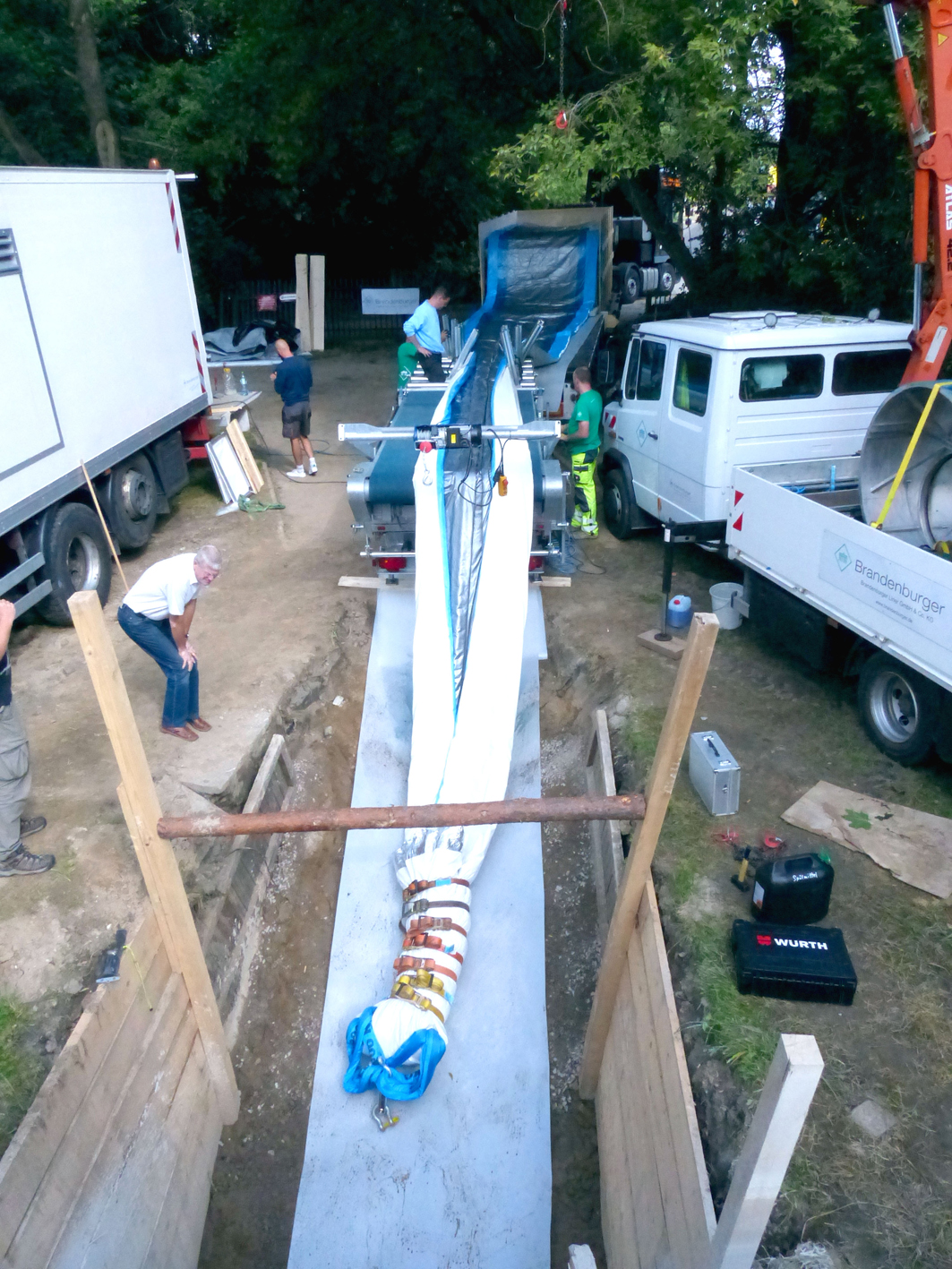 Um zehn Uhr dann der Schreck: Der Sensor des Förderbands streikte. Mithilfe der Kollegen aus Landau gelang es Marc Albrecht jedoch recht schnell, das Problem zu beheben, sodass der zusammengefaltete Liner ohne weitere Schwierigkeiten in den Kanal gezogen werden konnte.