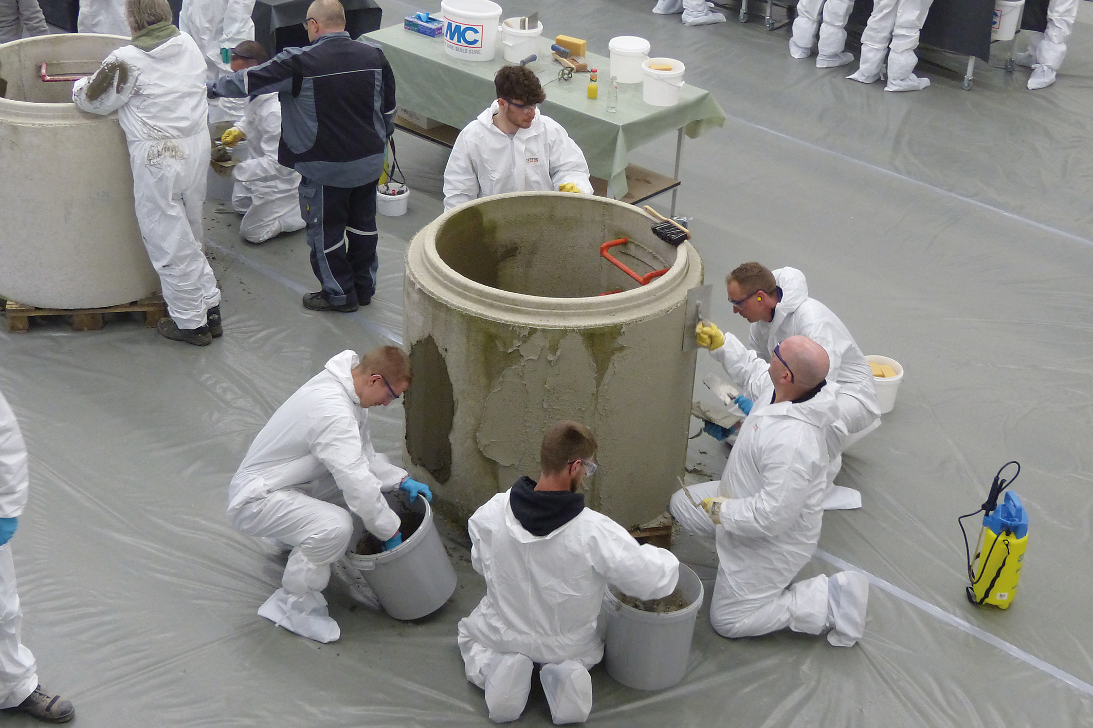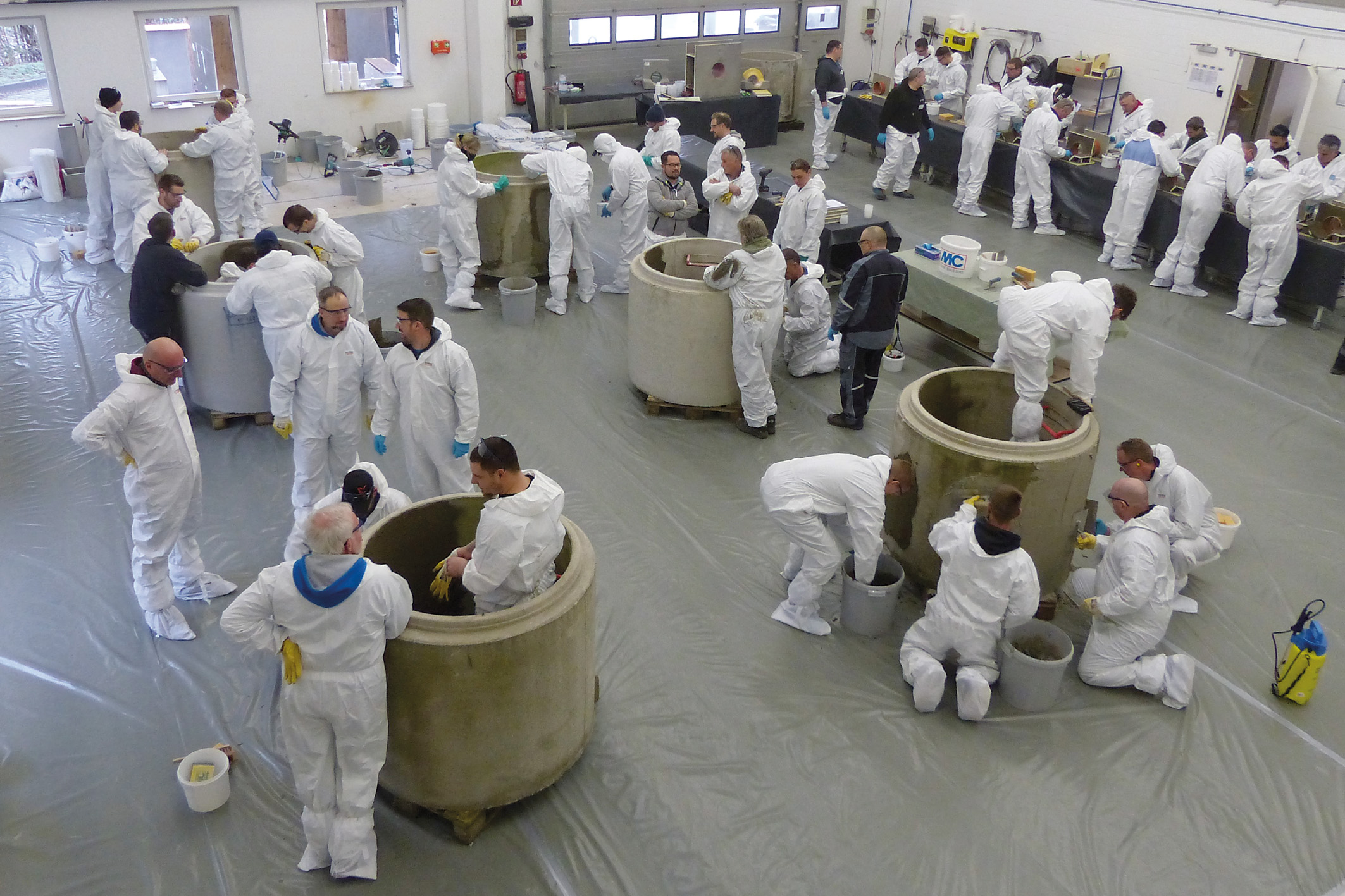 Ergänzt wurde der Grundlagenlehrgang durch einen Aufbaulehrgang zum Thema „Zertifizierte Schachtsanierung“ am dritten Tag. 20 Verarbeiter, die bereits an den vorherigen Tagen oder in den Vorjahren den Grundlehrgang erfolgreich absolviert hatten, konnten nun ihre Kenntnisse noch weiter vertiefen. So ging es beispielweise um die automatisierte Schachtbeschichtung, die Beschichtung mit Kunststoffsystemen, aber auch um Themen wie Arbeitssicherheit.