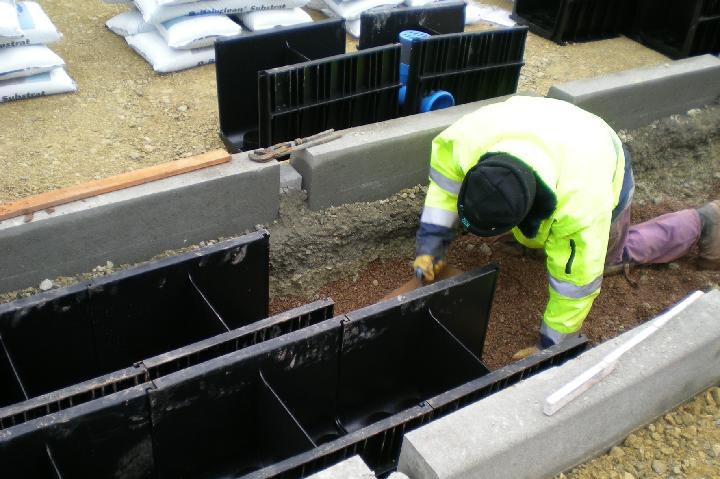Die D-Rainclean®-Sickermulde besteht aus 50 cm langen, 40 cm breiten und 37 cm hohen Kunststoffelementen. In Hallstadt wurde sie doppelstrangig zwischen zwei Parkplatzreihen mit jeweils 70 m Länge und inklusive zehn Notüberläufen eingebaut. "Um die zweireihige Anordnung realisieren zu können, wurde jeder Parkplatz um 0,5 m – von normal 5 m Länge auf 4,5 m – gekürzt", so Kümmel weiter. Eingeleitet wird in das System nur das Niederschlagswasser der Parkplätze, das über ein natürliches Gefälle in die Rinnen gelangt. Dort filtert die Sickermulde mit einem Substrat aus organischen Stoffen Schwermetalle und baut zusätzlich kleine Ölmengen zuverlässig ab. Das gereinigte Niederschlagswasser fließt dann in eine 4 m breite und 80 m lange Standard-Rigole, die sich unter dem D-Rainclean®-System befindet. Das gar nicht bzw. kaum belastete Regenwasser von den Dachflächen des Gebäudes wird extra gefasst und erreicht die Rigole über einen Kanal.
