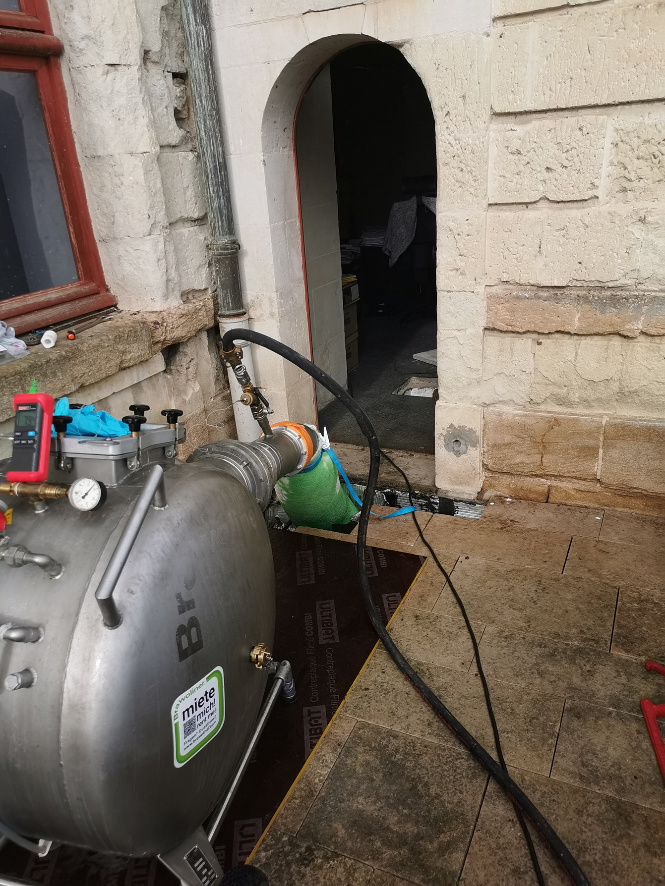 Das schöne Schlossanwesen der Marie de la Tour d' Auvergne, welches heute als Schule genutzt wird, litt an erheblichen Fassadenschäden und Schimmelpilzbefall im unteren Refektorium und in den darüber liegenden Büros. Schuld daran war ein defektes, altes, gusseisernes Regenwasserrohr, welches vom Dach und der Terrasse herabführt.