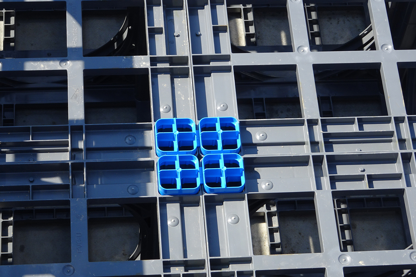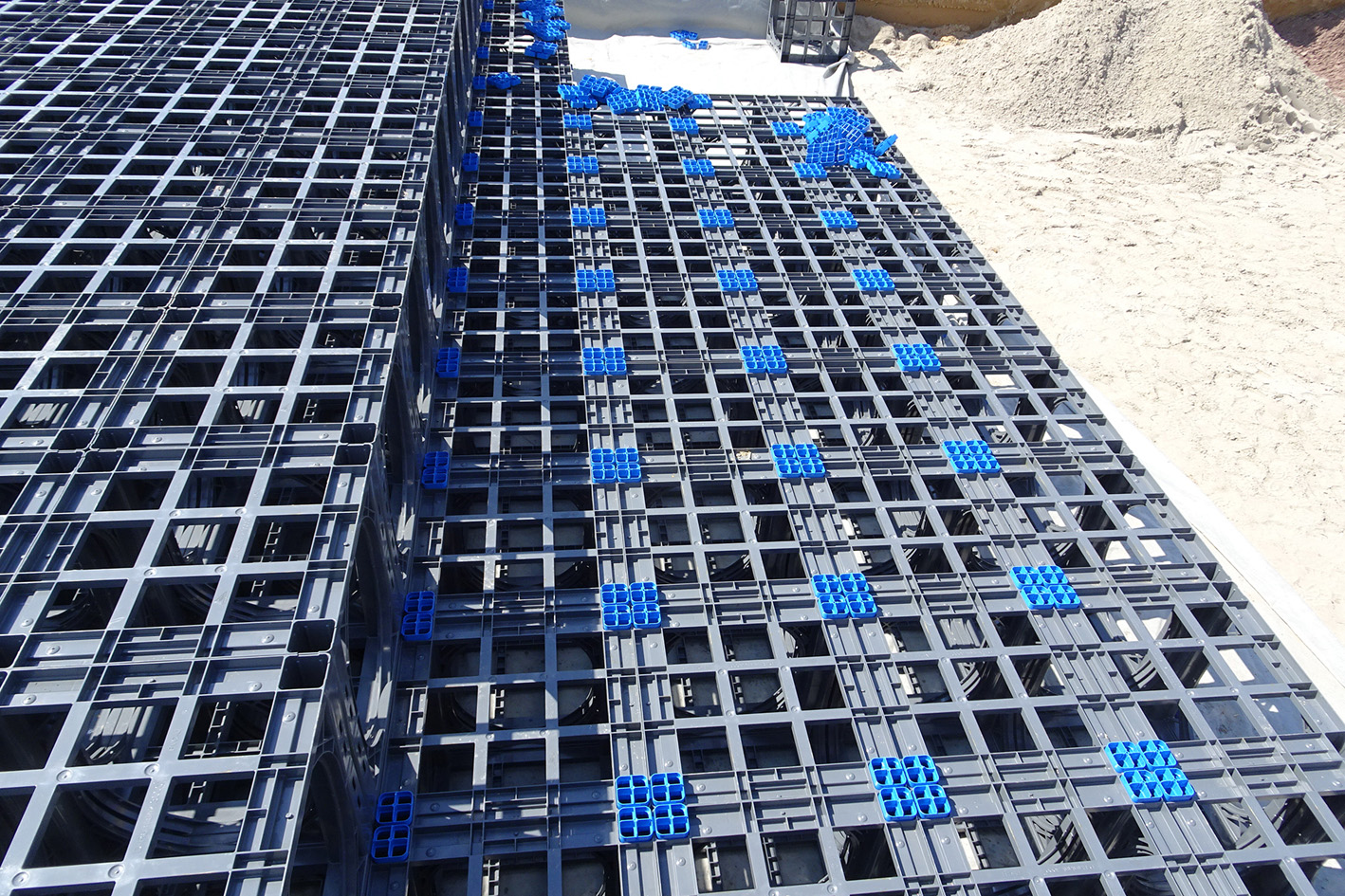 Die widerstandsfähigen Kunststoffelemente des Systems D-Raintank 3000® haben die Maße L x B x H 600 x 600 x 600 mm und sorgen dank ihrer stabilen Konstruktion für eine optimale Kraftübertragung ins umliegende Erdreich. In Herxheim wurden je 155 Tanks in 25 Reihen zweilagig angeordnet. Blaue Vierfachverbinder stellen dabei sicher, dass die Lagen nicht verrutschen können.