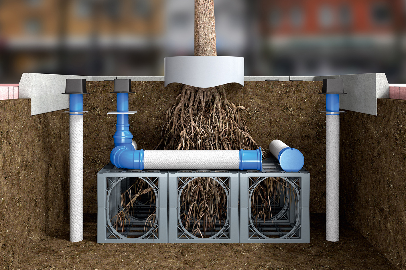 Während die für die Baumpflege entwickelten Spezialprodukte durch ihren Einsatz bereits zu einer deutlichen Verbesserung von Baum-Standorten beitragen, lässt sich durch ihre gemeinsame Verwendung – so zum Beispiel in Kombination mit dem D-Raintank 3000® – ein optimaler Baumstandort schaffen, der auch unter widrigsten Rahmenbedingungen seien Funktion zuverlässig erfüllt. Die neuartige Konstruktion des D-Raintank 3000® mit seinen großen seitlichen Öffnungen schafft die Voraussetzung dafür, dass die Elemente nach ihrem Einbau einfach und schnell mit Baumsubstrat gefüllt werden können. Um den Wurzelballen angeordnet, sorgt das für einen sicheren und jederzeit gut durchwurzelbaren Standort.