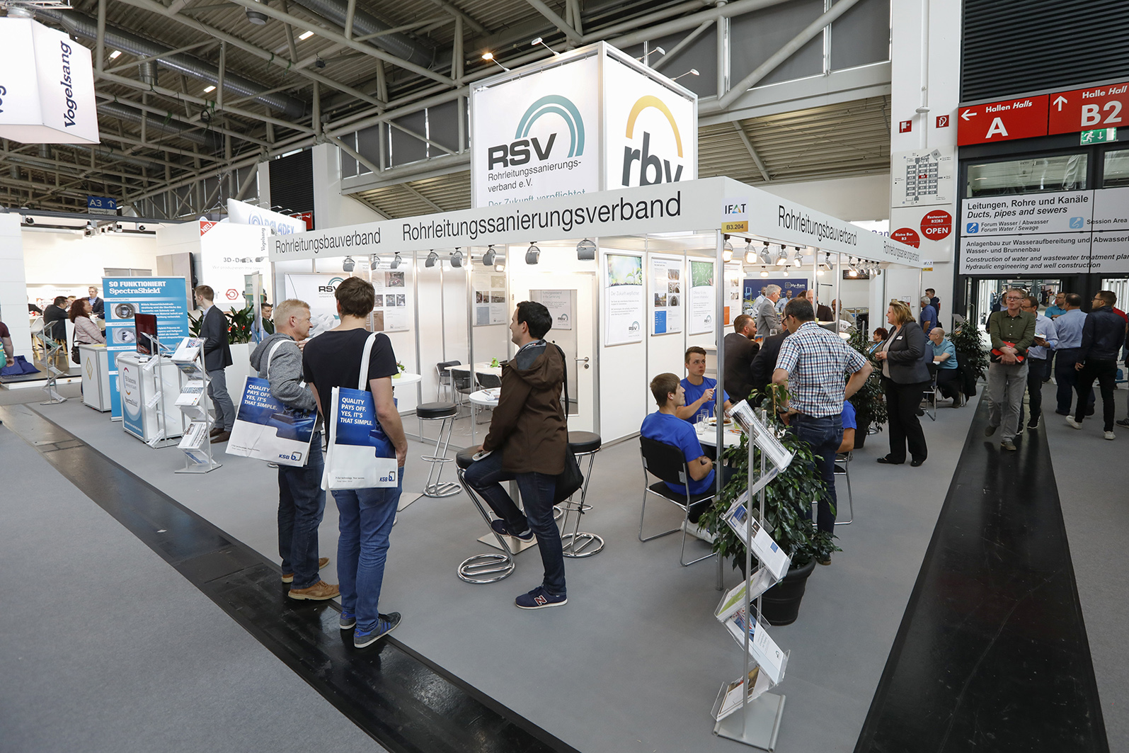 Erneut konnte die IFAT Rekordzahlen vermelden: 141.000 Besucher und damit 4 % mehr als noch auf der letzten Messe vor zwei Jahren und eine um 7 % auf rund 3.300 gestiegene Ausstellerzahl unterstrichen den Anspruch der IFAT als Weltleitmesse in ihrem Bereich. Von der gestiegenen Beteiligung profitierte auch der rbv: Günstig am „Schnittpunkt“ dreier Hallen-Zu- und -Ausgänge gelegen, führte am Gemeinschaftsstand von rbv und RSV nahezu kein Weg vorbei.