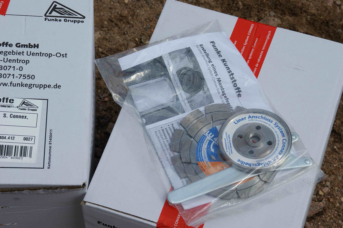 Funke-Fachberater Dipl.-Ing. Olaf Schreiter: „Der Einbau des Anschlusses erfolgt über ein Arbeitsfenster, welches mit einem geeigneten Werkzeug wie einem Winkelschleifer herzustellen ist. Um eine Beschädigung des Liners auszuschließen, empfiehlt sich hierbei der Einsatz der Funke-Anschlagscheibe zur Schnitttiefenbegrenzung. Bei der fachgerechten Montage der einzelnen Bauteile wird eine kraftschlüssige Verbindung zum Liner geschaffen, bei der bauartbedingte Unebenheiten des Liners ausgeglichen werden können.“
