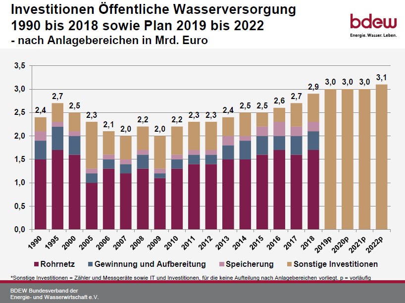 Um auch weiterhin eine sichere Versorgung mit Trinkwasser zu garantieren, leisten die Wasserversorger hohe Investitionen: Jährlich fließen rund drei Milliarden Euro in die öffentliche Wasserversorgung. Mehr als die Hälfte davon, etwa 1,7 Milliarden Euro, werden ins Trinkwassernetz investiert. Die restlichen Investitionen fließen etwa in Gewinnung, Aufbereitung und Speicherung von Trinkwasser.