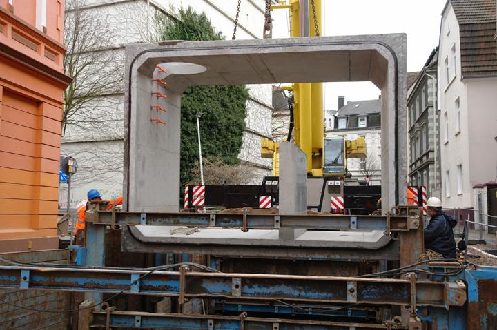 In der Woche vor Ostern war es so weit: Spezialtransporter brachten großvolumige Betonfertigteile auf eine Kanalbaustelle in die Bachstraße im Hagener Stadtteil Wehringhausen. Hier erstellt die Ingenieurbau Errenst GmbH im Auftrag der Stadtentwässerung Hagen – SEH (AöR) seit Juli vergangenen Jahres ein neues Regenüberlaufbauwerk.