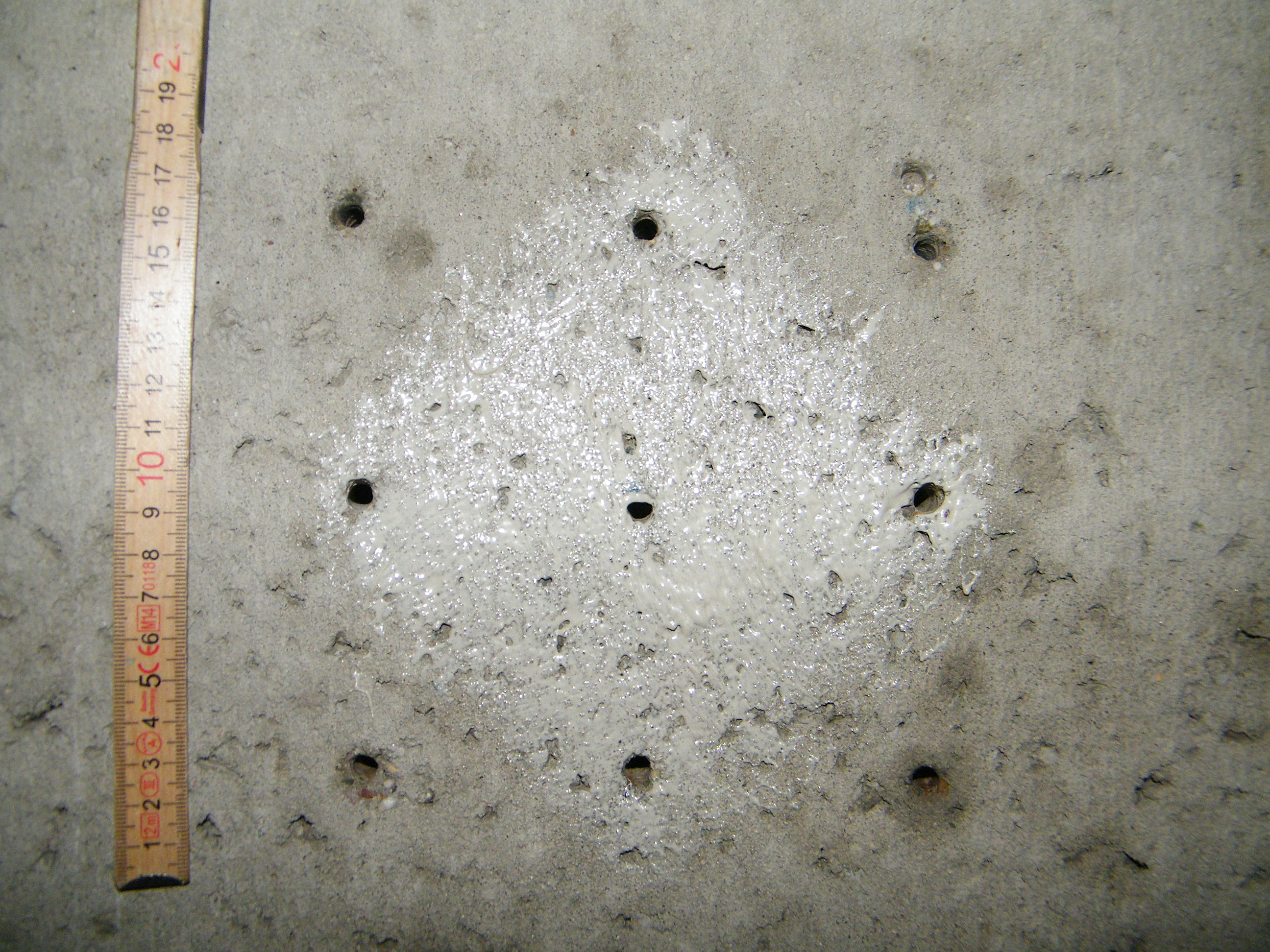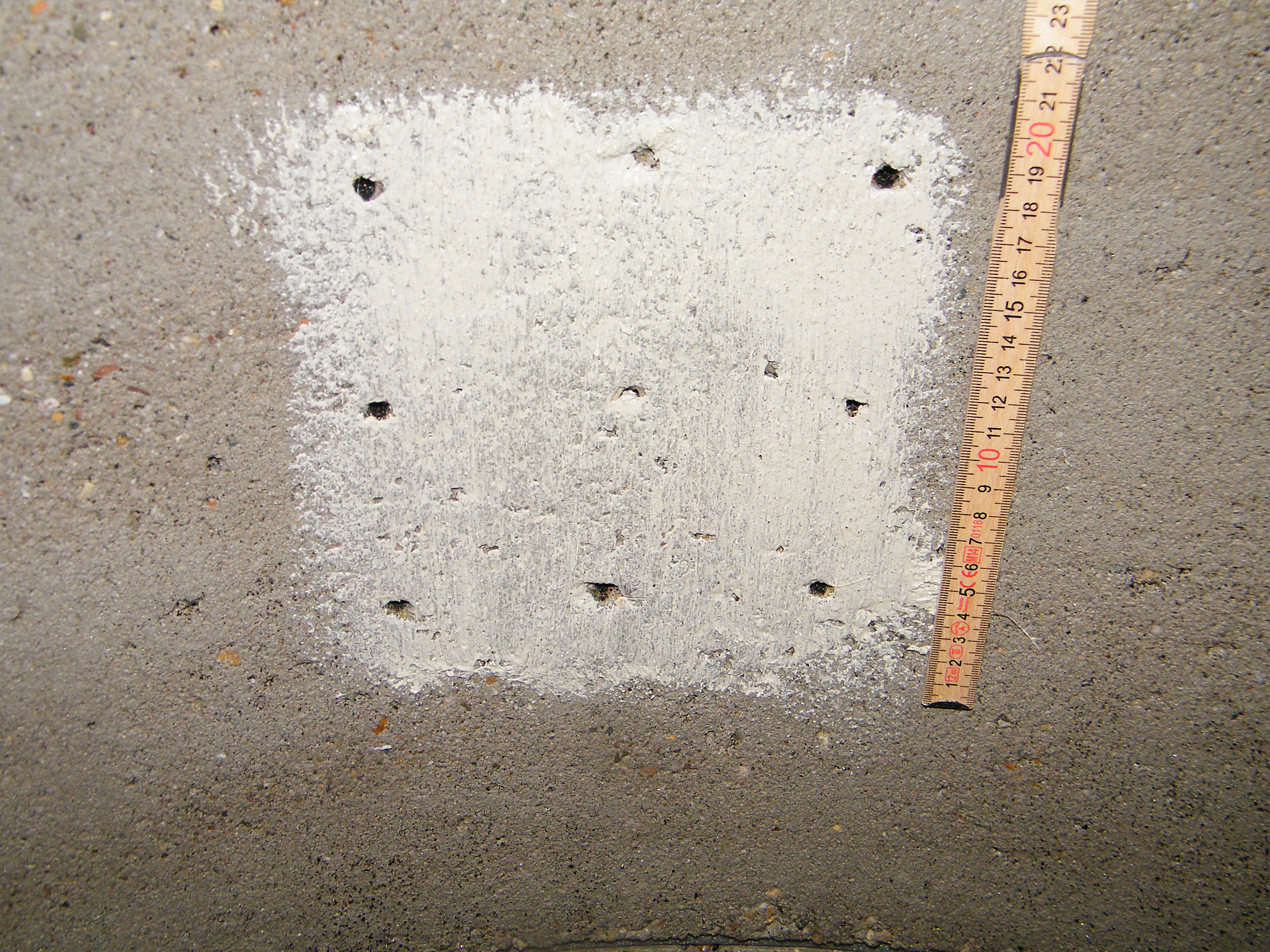 - 4x „Flächiger Schaden“: 9 Bohrlöcher mit 5 mm Durchmesser auf einer Fläche von 20 cm x 20 cm mit Simulation von punktuellen Mängeln bei der Untergrundvorbereitung (Trennmittel)