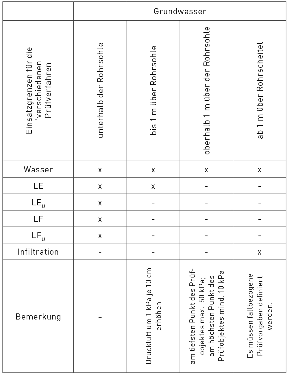Zum Zeitpunkt der Dichtheitsprüfung muss die Grundwassersituation im Bereich des Prüfobjektes dokumentiert werden. In Abhängigkeit des Grundwasserstandes bezogen auf den äußeren Rohrscheitel oder die innere Rohrsohle ergeben sich die in der Tabelle dargestellten Einsatzgrenzen der Verfahren.