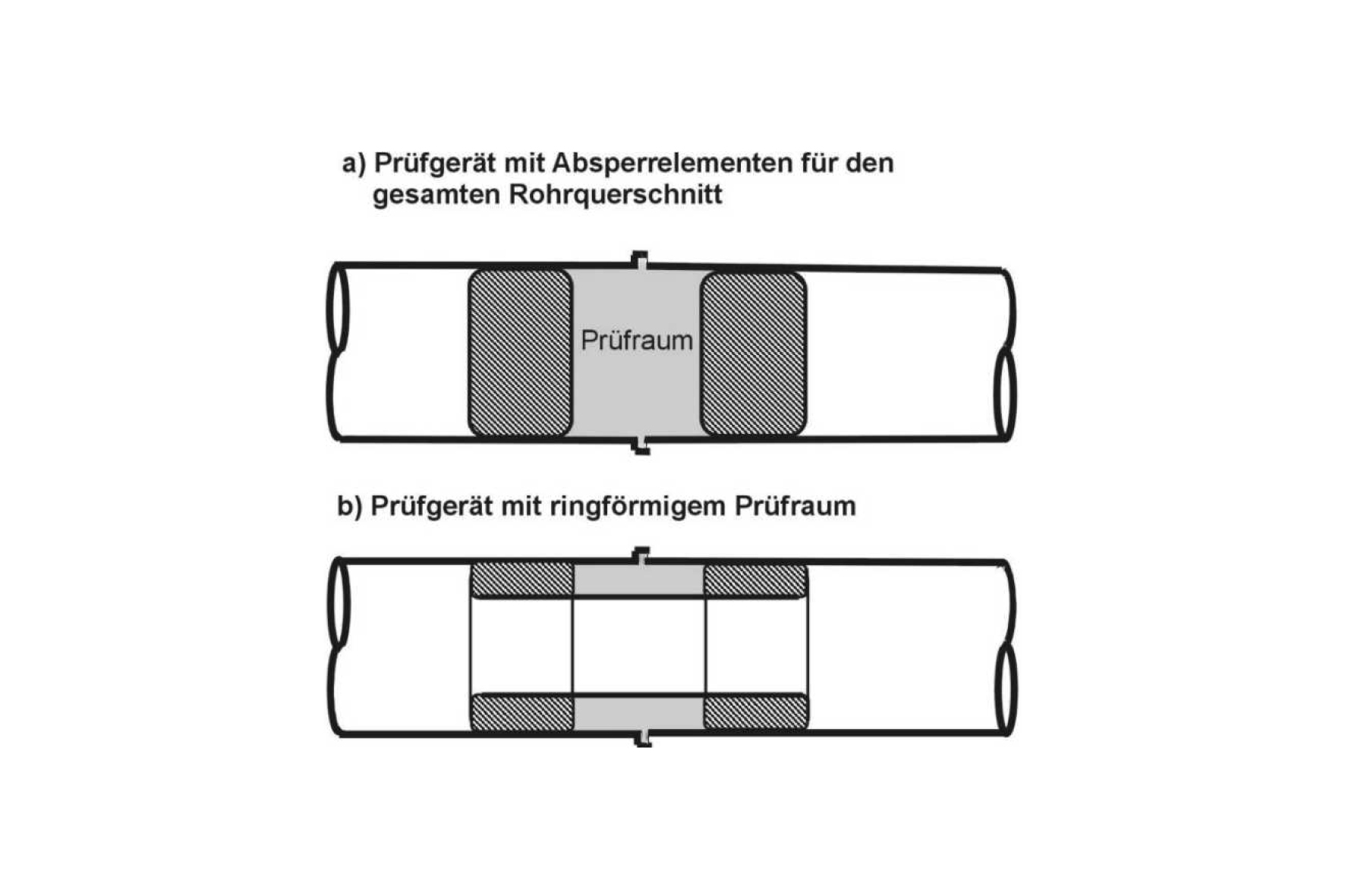 Darüber hinaus enthält Abschnitt 13.4.1 weitere Angaben, die im Falle einer Prüfung einzelner Rohrverbindungen einzuhalten sind. Dies betrifft unter anderem die exakte Positionierung der Absperrelemente, die Einsehbarkeit des Prüfraumes sowie die Verwendung von Doppelpackersystemen.