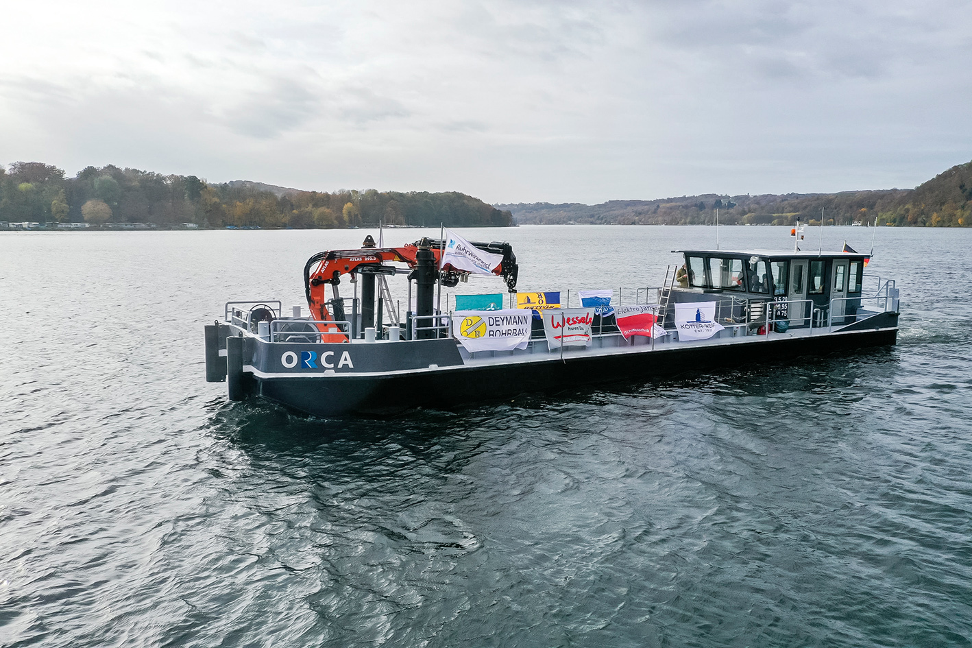 Imposante 19,95 Meter Länge und 5,20 Meter Breite misst das neue Arbeitsschiff des Ruhrverbands, die „Orca“. Ein neues Zuhause hat das – nach einem Schwertwal (Orca) benannte – Arbeitsschiff im Hafen Scheppen am Essener Baldeneysee gefunden. Neben einem weiteren Arbeitsschiff des Ruhrverbands sowie zahlreichen Motorbooten ist die „Orca“ hauptsächlich als „Allround-Arbeitsgerät“ zur Gewässerunterhaltung vorgesehen. Sie wurde auch speziell für Arbeiten an den Stauwehren am Baldeneysee und Kettwiger See konzipiert und verfügt aus diesem Grund über einen leistungsfähigen Kran sowie versenkbare Stelzen, um auch über größere Längen arbeiten zu können. Maßgebend für die Bemessung des Krans war unter anderem der Austausch der Schleusenantriebe des Untertors Baldeney vom Oberwasser aus. Die Breite der „Orca“ wurde so gewählt, dass das Schiff die Schleusen der Ruhr passieren kann.