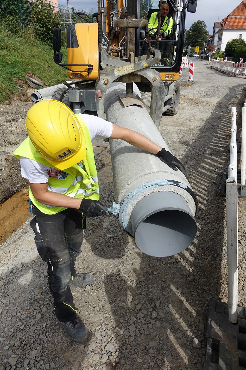 „Dabei wird ein Schacht mit einer Blase abgesperrt und das Abwasser zur Aufrechterhaltung der Vorflut über eine Leitung in den nächsten Schacht gepumpt“, erklärt Björn Ringsdorf, Bauleiter Heinrich Weber Straßen- und Tiefbau GmbH & Co. KG. Danach können die alten Kanalrohre entfernt und die Sohle für die Verlegung der neuen Rohre vorbereitet werden.