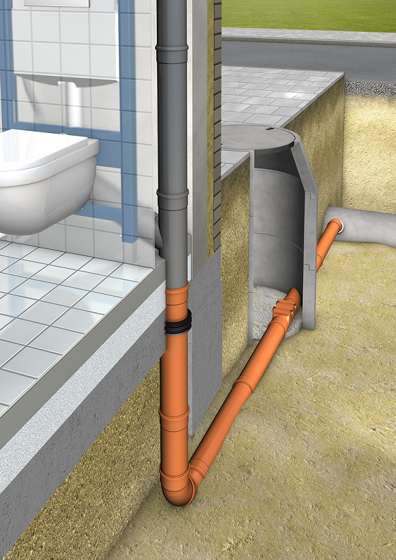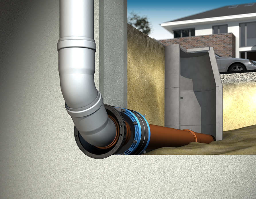 Die einzelnen Entsorgungsleitungen werden im Keller gebündelt und durch eine Durchdringung Richtung Kanal geführt. Mit dem Curaflex® Bauherrenpaket steht eine zuverlässige Lösung für die häufig im Wohnungskellerbau verwendeten Doppel-/Elementwände zur Verfügung.