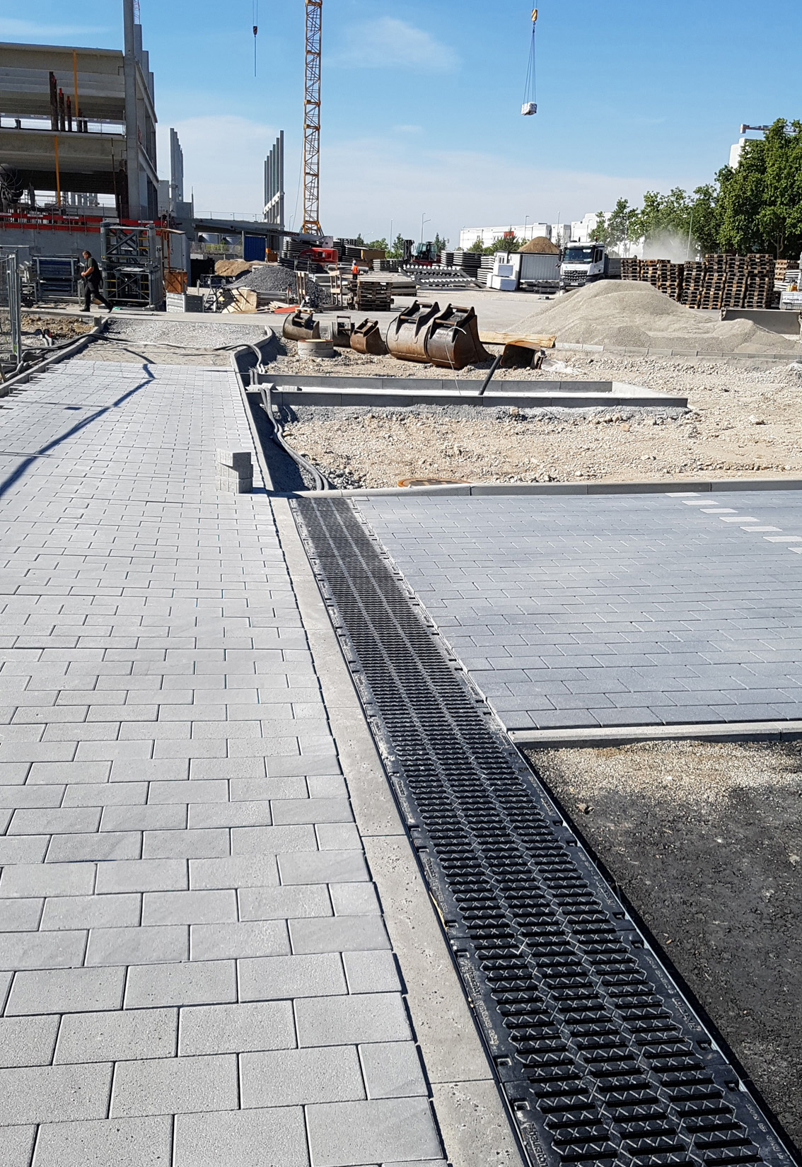 Die Rinnenkörper werden aus faserbewehrtem Beton hergestellt und sind für höchste Belastungen ausgelegt. Selbst während der Bauphase sind die noch nicht fertig eingebauten Rinnen so stabil, dass Baufahrzeuge über sie fahren können, ohne dass sie Schaden nehmen. Die auf den Parkflächen eingebauten Rinnen und Abdeckungen entsprechen der Klasse D 400. Der Schnellverschluss Side Lock ermöglicht dabei ein schnelles Lösen der Abdeckungen.