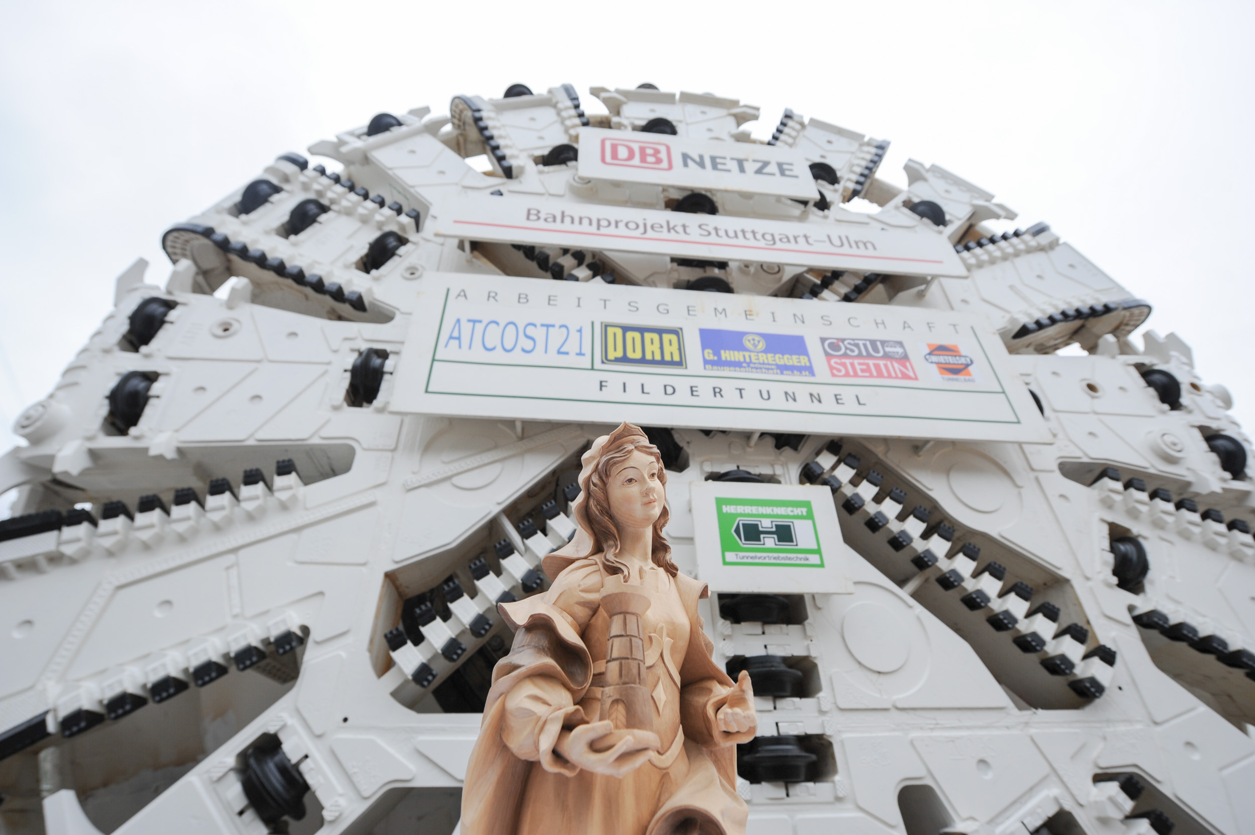 Die 2.000 Tonnen schwere Tunnelbohrmaschine der Herrenknecht AG nimmt die Arbeit auf. Zwei eingleisige Tunnelröhren wird sie durch die Hochebene Filder, die sich im Süden der baden-württembergischen Landeshauptstadt Stuttgart erstreckt, graben.