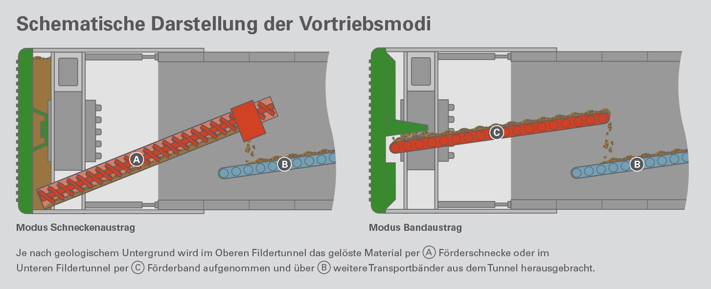 Die Tunnelbohrmaschine ist eine Multi-Mode-Maschine. Das bedeutet, dass die Maschine umbaubar ist. Im oberen Abschnitt des Fildertunnels arbeitet sie im geschlossenen Modus mit Schneckenförderung, im unteren Fildertunnel im offenen Modus mit Förderbandaustrag. Der Grund dafür sind die unterschiedlichen Gesteinsschichten: Die Maschine muss Stubensandstein und Knollenmergel sowie unausgelaugten Gipskeuper durchdringen. Die Tunnelbohrmaschine überwindet eine Höhendifferenz von 155 Metern bzw. eine Steigung von bis zu 2,5 Prozent. Nur in der Mitte des Tunnels, in der geologischen Übergangszone, kommt die Maschine nicht zum Einsatz. Dort werden Mineure das Material mit Bagger und Lockerungssprengungen aus dem Berg lösen.