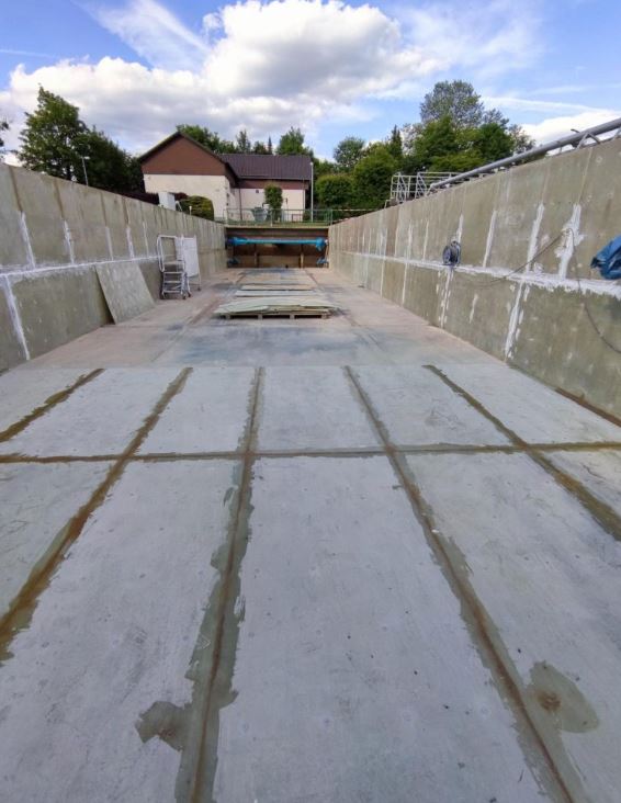 Stadtwerke Betriebsleiter Heiner Wetz: „Als wir nun die Sanierung des Nachklärbeckens planten, waren wir uns zunächst nicht sicher, ob eine Auskleidung mit GFK-Platten bei einem so großen Becken mit einer Länge von 51 Metern und einer Breite von 7,70 Metern sowie einer durchschnittlichen Tiefe von 2,65 Metern mit den benötigten Dehnungsfugen technisch ebenso problemlos umsetzbar wäre.“ Fraglich war zudem, wie sich die Auskleidung bei einem unterschiedlichen Temperaturgefälle im Bereich der Wasserspiegellinie verhält.
