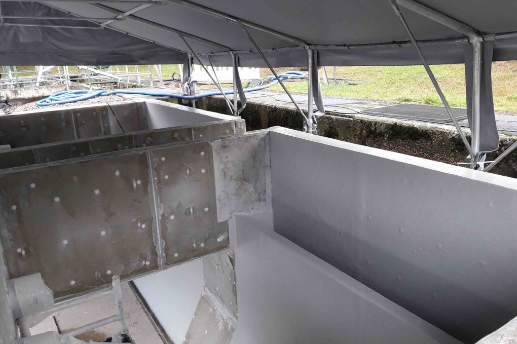 Die freiliegende Bewehrung wurde entsprechend den Anforderungen der Betoninstandsetzung mit Korrosionsschutz beschichtet und die korrodierte Bewehrung ersetzt.“ Im Anschluss daran startete die Auskleidung mit den GFK-Platten, die sich an einigen Stellen als Puzzlearbeit gestaltete, wie Heinz erklärt: „Im Nachklärbecken sind verschiedene technische Einrichtungen installiert, unter anderem ein Bodenräumer für den Schlammabzug. Dazu kommen mehrere querverlaufende Ablaufrinnen mit Zackenwehren, über die das geklärte Abwasser in längsverlaufende Rinnen geleitet wird.