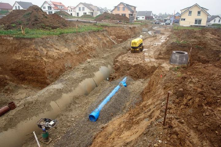 Dass in der oberschwäbischen Stadt PVC-U-Rohre von Funke zum Einsatz kamen, war ein Novum und auf die Erfahrungen von Planer Dipl.-Ing. (FH) Erwin Schmid zurückzuführen. Der Geschäftsführer von ES tiefbauplanung: „Bei vorangegangenen Baumaßnahmen haben wir uns bereits von den positiven Eigenschaften dieses Materials überzeugen können. Deshalb haben wir das HS®-Programm für das Erschließungsgebiet vorgeschlagen.“ Eine gute Entscheidung, wie auch Schmids Mitarbeiter, Bauleiter Dipl.-Ing. (FH) Andreas Christ, und Polier Hans Maier von der Gebr. Maier Kieswerk und Tiefbau GmbH bestätigen können. Denn neben der eindeutigen Farbgebung von blau für Regen- und braun für Schmutzwasser, die eine Unterscheidung von Außen und Innen selbst nach Jahren noch zuverlässig ermöglicht, punkten die Rohre und Formteile des Hamm-Uentroper Unternehmens durch eine hohe Belastbarkeit und Stabilität: Die komplette Produktpalette ist wandverstärkt (SDR 34); zudem liegt die Ringsteifigkeit bei 12 kN/m2. Für die Gegebenheiten in Mittelbiberach waren dies ideale Voraussetzungen. „Die Verlegetiefen vor Ort reichten bis 5,20 m. In Frage kommen da nur robuste Rohre“, so Bauleiter Christ. Dass das HS®-Kanalrohrprogramm von Funke hier seine Vorteile voll ausspielen kann, erläutert Funke-Fachberater Gerald Barth: „Die Rohre können in Einbautiefen zwischen 0,5 und 6,0 m unter Schwerlastverkehrsflächen bis 60,0 t verlegt werden.“ Verbaut wurden auf dem 2 ha großen Erschließungsgebiet neben Abzweigen und FABEKUN®-Sattelstücken insgesamt 420 m HS®-Kanalrohre der Nennweite DN/OD 200 für Schmutzwasser, 140 m DN/OD 315 für Regenwasser, 100 m DN/OD 160 für die Straßenentwässerung sowie insgesamt 280 m HS®-Kanalrohre in braun und blau im Hausanschlussbereich.