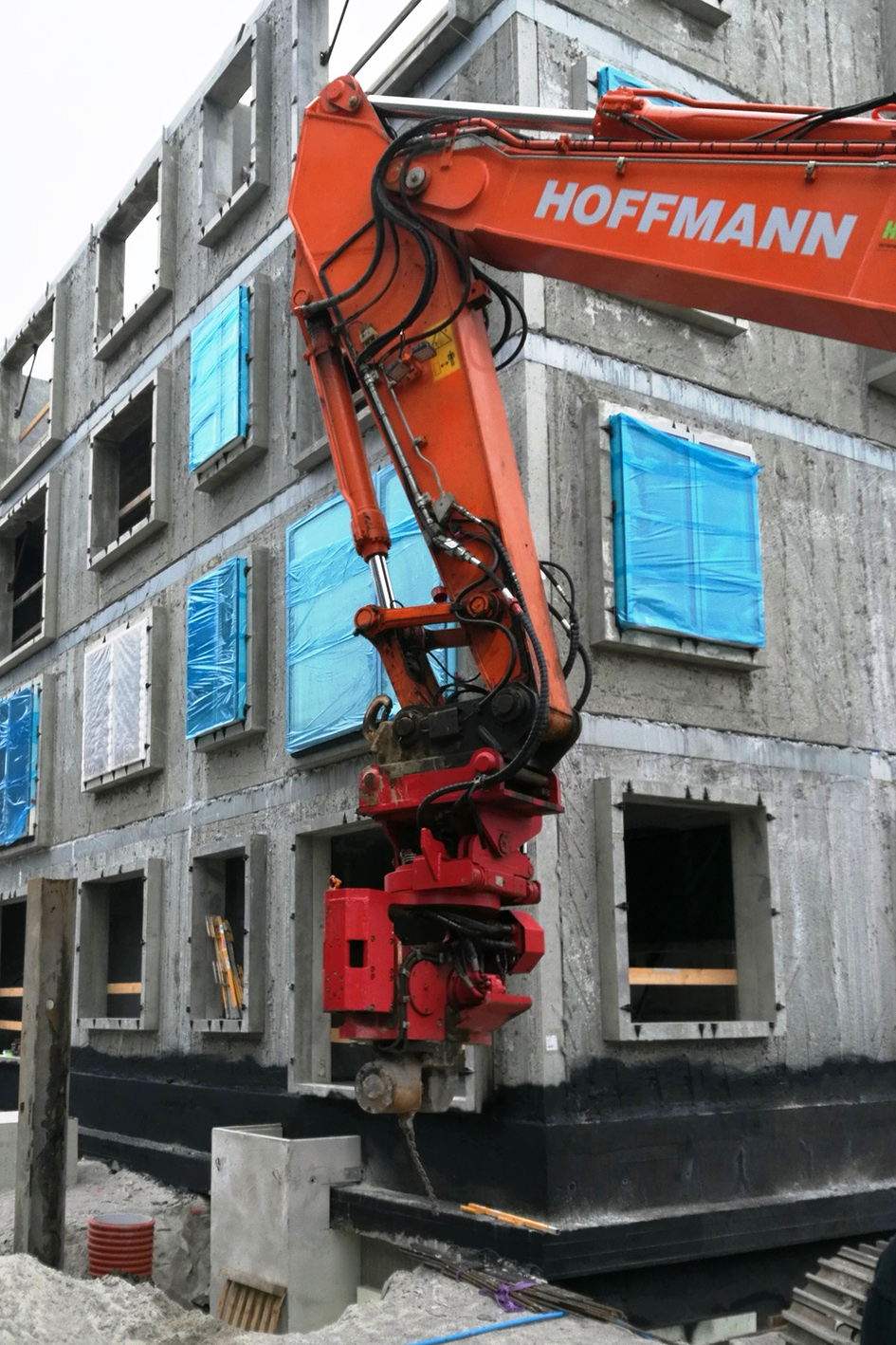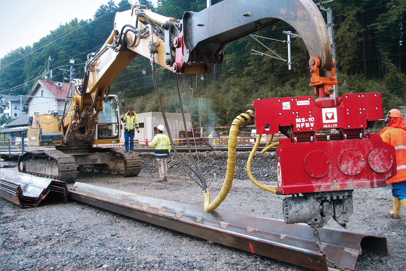 Zusätzlich bietet das müller Portfolio Seitengreifer an, die das Rammgut von der Seite greifen und in den Boden vibrieren können und so das Arbeiten bei begrenzter Bauhöhe ermöglichen. Zu den Einsatzbereichen zählen Ramm- und Zieharbeiten, das Einbringen von Spundwandprofilen und Rohren sowie von Kunststoffprofilen, Holzpfählen, Leichtprofilen und Bewehrungskörben. Erwähnenswert ist, dass die müller Baggeranbauvibratoren auch für schwingungssensible innerstädtische Bereiche und für einen Einsatz in schweren Böden geeignet sind.