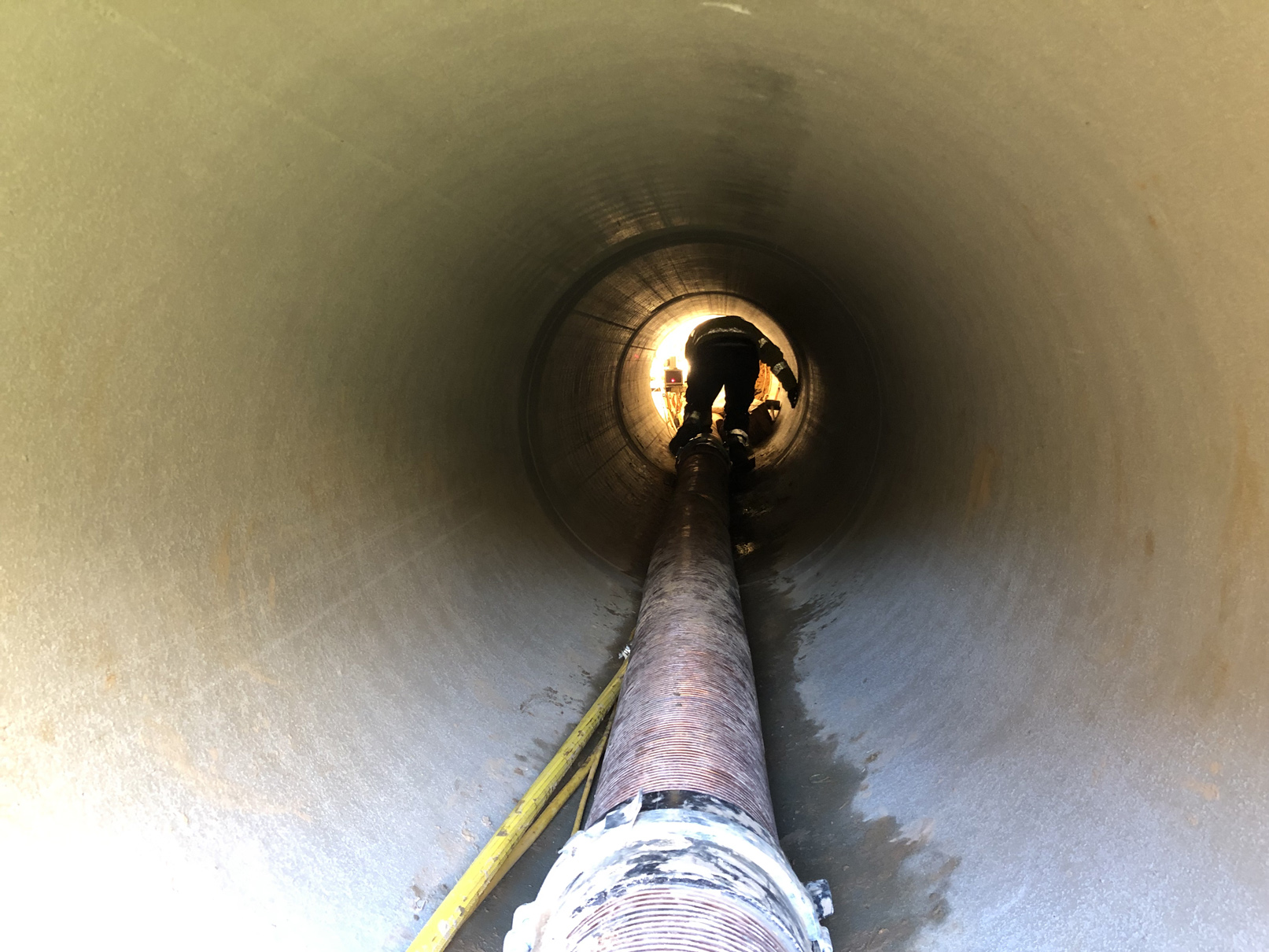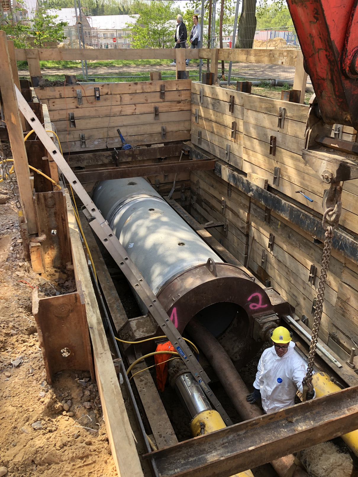 Eine vierköpfige Kolonne übernahm daber Ende April 2019 den bemannten Rohrvortrieb mit manuellem Bodenabbau an der offenen Ortsbrust. Die Erde wurde mit einem Erdsauger aus dem Vortriebsrohr befördert.