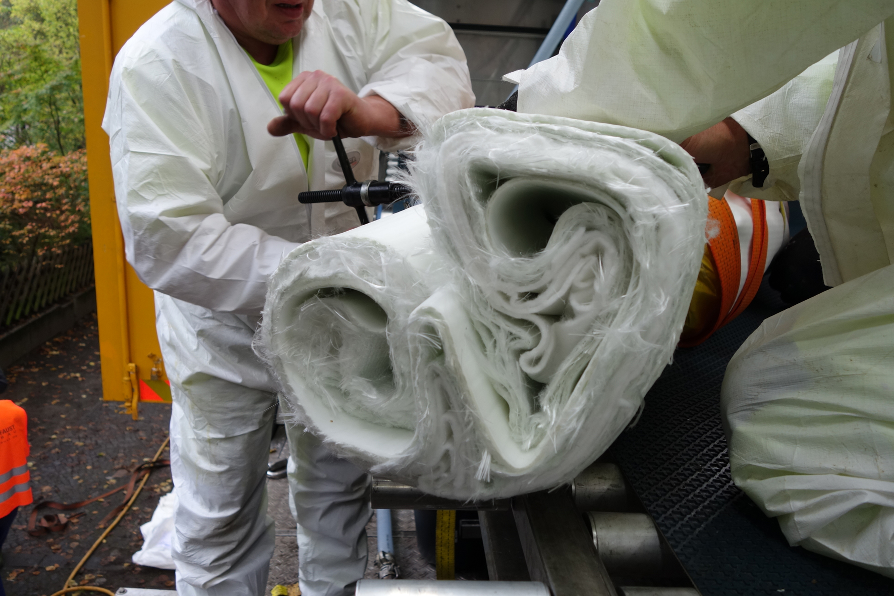 Die Liner wurden in jedem Bauabschnitt über vier Bögen mit jeweils 45° inversiert und anschließend mit Wasserdampf ausgehärtet. Das neu installierte Rohr ist allein tragfähig und übernimmt ohne Unterstützung des Altrohres alle anfallenden statischen Außen- und Innenlasten. Um einen dauerhaft dichten Übergang zwischen der bestehenden Rohrleitung und dem sanierten Teilstück zu schaffen, wurden die beiden Rohrenden des Liners mit RedEx® Linerendmanschetten der Pipe-Robo-Tec GmbH & Co. KG abgedichtet. Die Manschetten bestehen aus trinkwasserzugelassenem EPDM-Gummi und werden mit Edelstahlspannringen im Rohr verspannt.